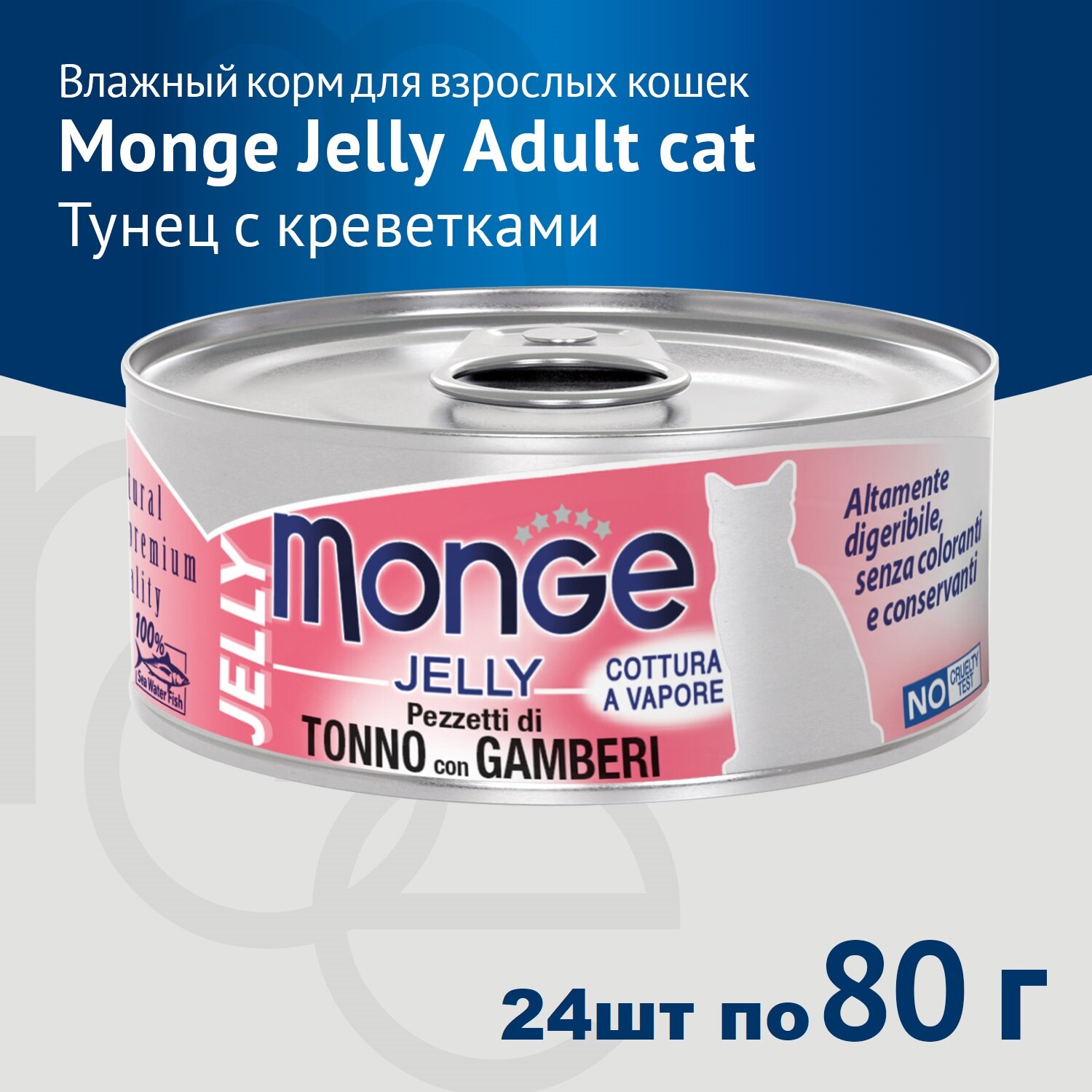 Купить Monge Jelly Adult Cat влажный корм для взрослых кошек с желтоперым тунцом и креветками, в консервах - 80 г х 24 шт