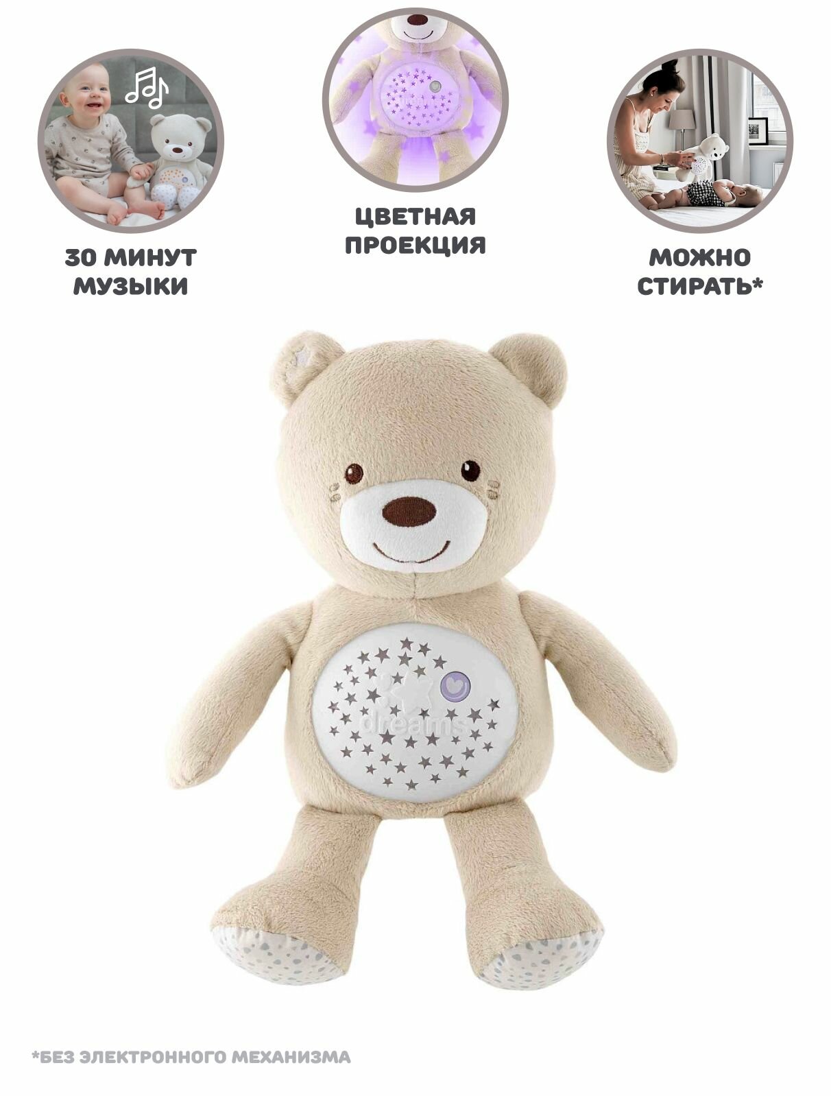 Игрушка мягкая с ночником проектором Chicco Мишка музыкальный бежевый