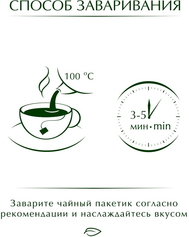 | Способ приготовления | заварить чайный пакетик в чашке или заварочном чайнике кипяченой водой и настоять 2-4 минуты. |