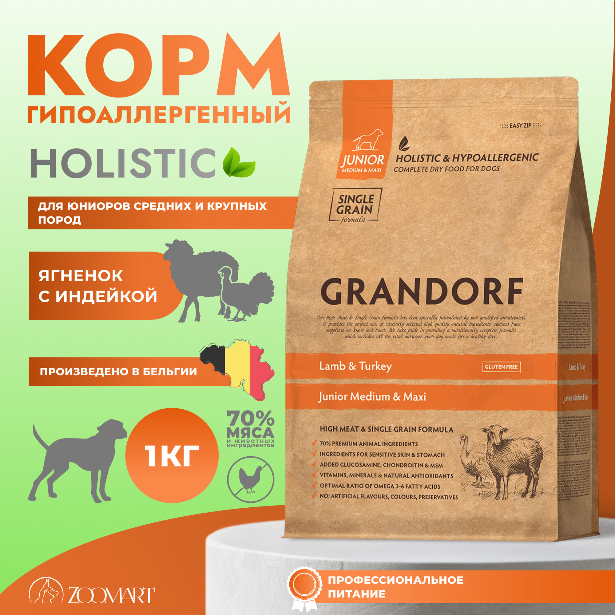 Сухой корм GRANDORF DOG Lamb&Turkey JUNIOR для щенков и юниоров с 4 до 12 месяцев, ягнёнок с индейкой, 1 кг.