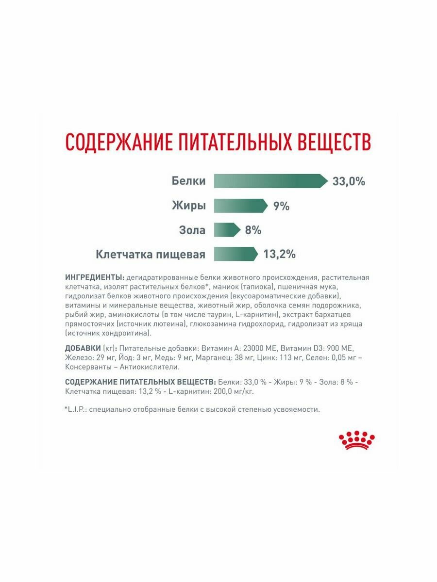 | Состав | дегидратированное мясо птицы, растительная клетчатка, тапиока, пшеничная клейковина, кукурузная клейковина, пшеничная мука, гидролизат животных белков, животные жиры, минеральные вещества, жом цикория, рыбий жир, оболочки и семена подорожника, гидролизат из панциря ракообразных (богат глюкозамином), экстракт бархатцев прямостоячих (источник лютеина), гидролизат из хряща (источник хондроитина) |