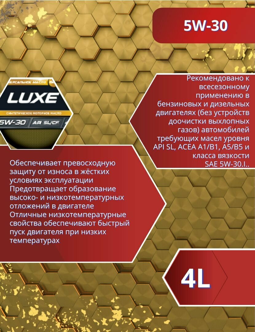 Масло моторное Лукойл Luxe 5w30 полусинтетическое, API SL/CF, универсальное, 4л, арт. 196256