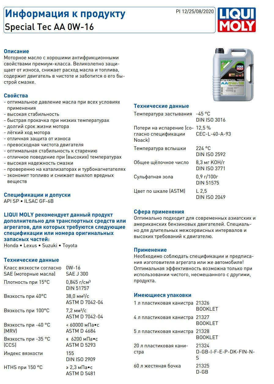 LIQUI MOLY 21327 Special Tec AA 0W-16 SN Plus + RC GF-5 (4л)