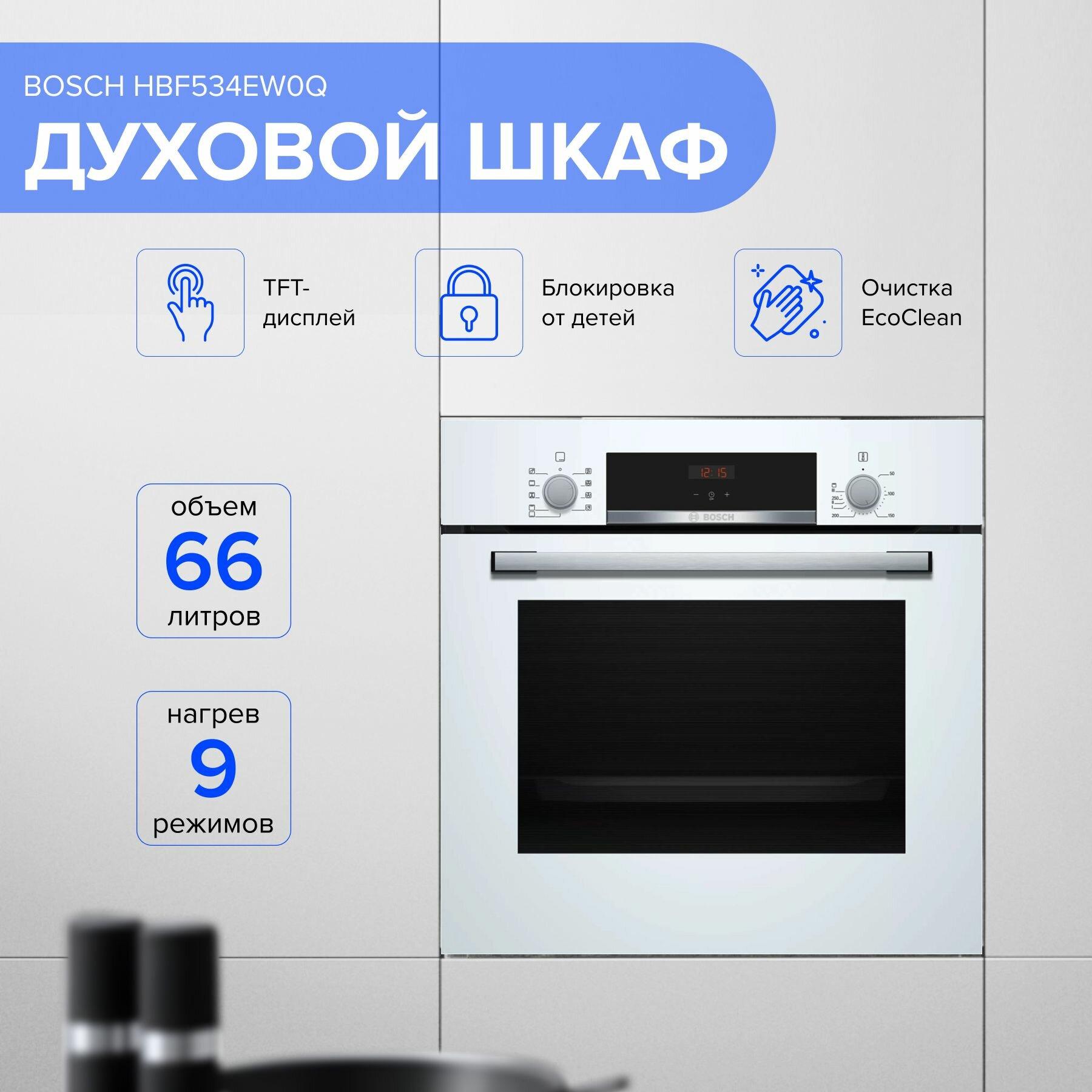Ниже Вы можете прочитать отзывы на Электрический духовой шкаф Bosch HBF534EW0Q с объемом 66 литров с конвекцией, грилем и каталитической очисткой, белый, ознакомится с подробными характеристиками, посмотреть интересные обзоры и фотографии на Электрический духовой шкаф Bosch HBF534EW0Q с объемом 66 литров с конвекцией, грилем и каталитической очисткой, белый.