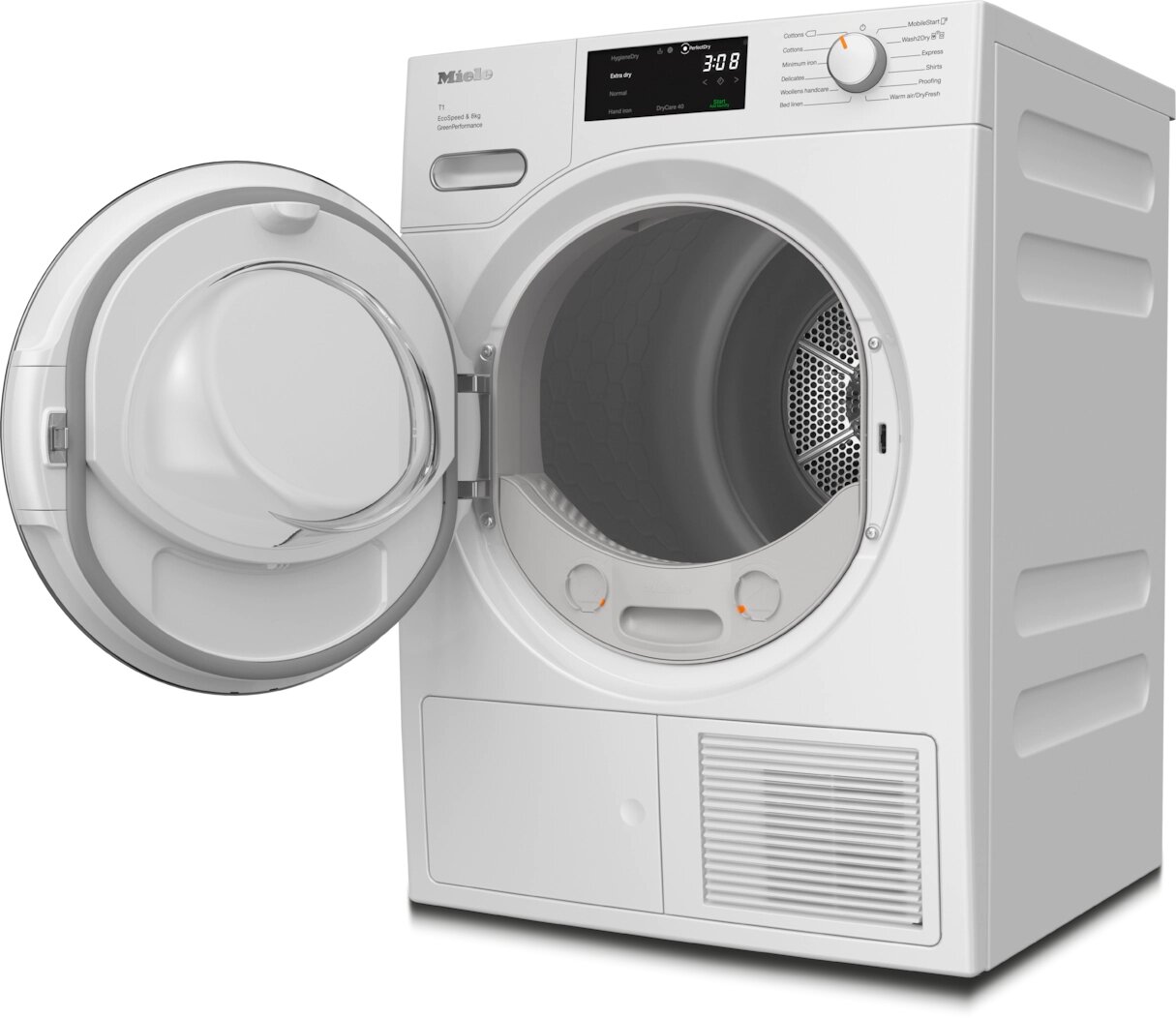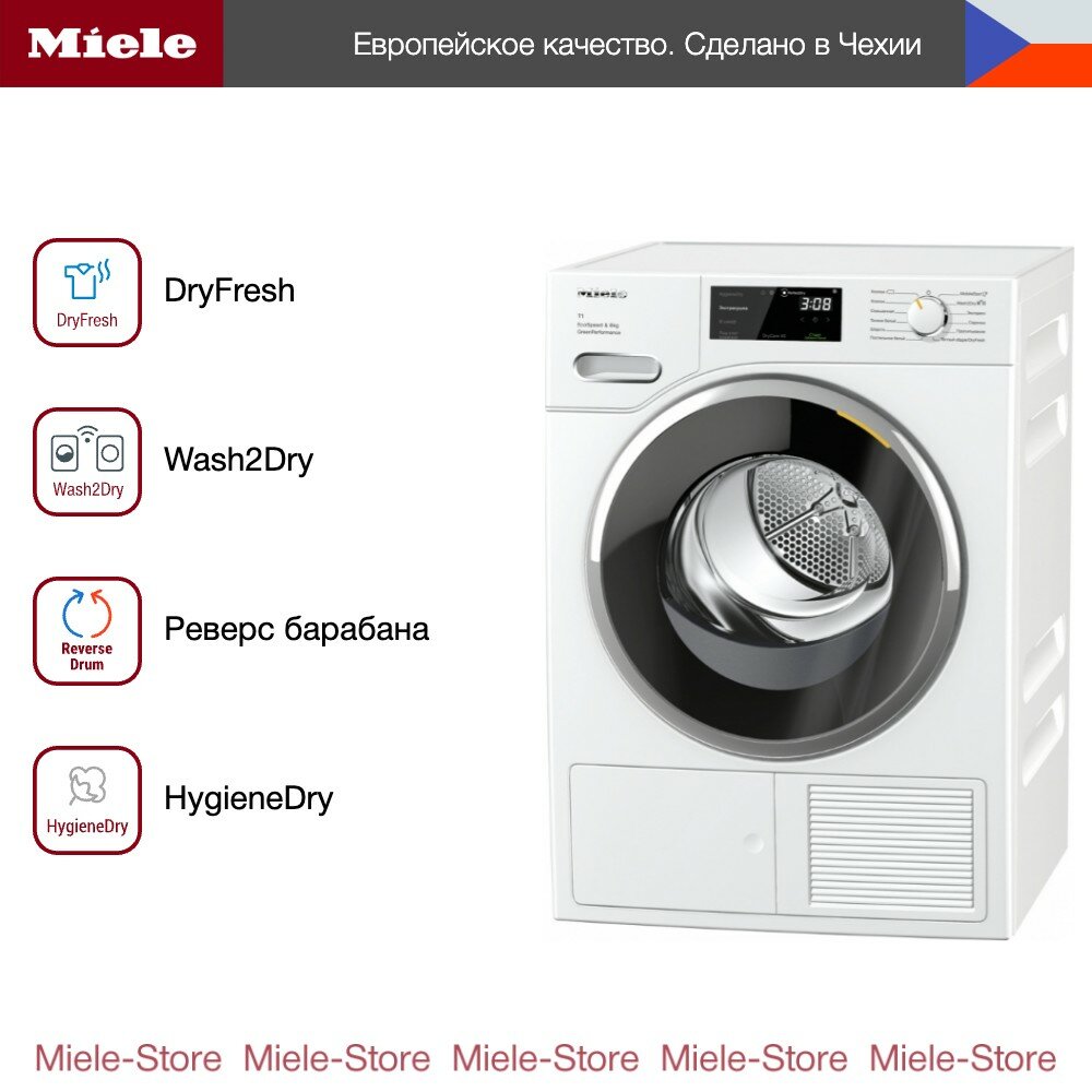 | Дополнительная информация | объединение в сеть с системой Miele@home, блокировка ПИН-кодом, индикация «Вылить конденсат», индикация «Очистить фильтр», длина сетевого кабеля: 2 м; тип хладагента: R290, количество хладагента: 0,14 кг, воздействие хладагента на глобальное потепление: 3 CO₂e; опция DryCare 40: высушивает бельё, выстиранное при 40 °C; функция AddLoad: можно легко добавить или вынуть бельё даже после запуска программы; Wash2Dry: сушильная машина автоматически использует ту же программу, что и стиральная |