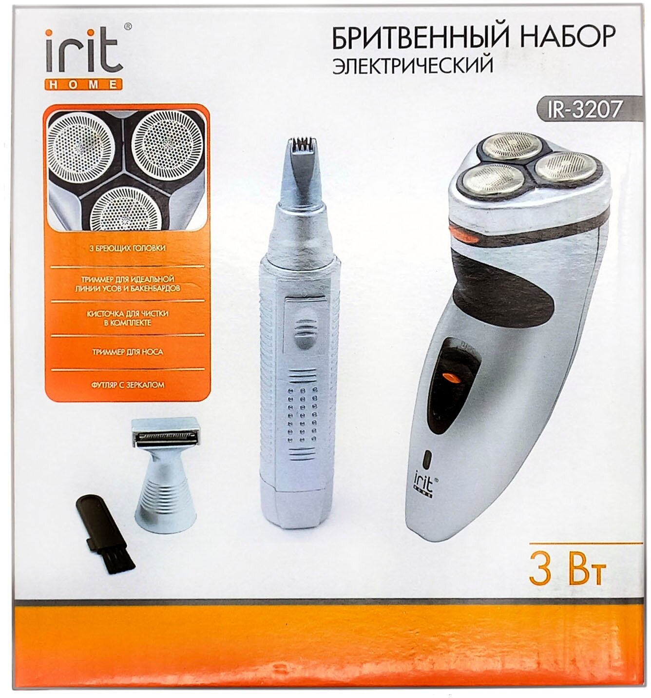 Бритвенный набор / Бритва IRIT, IR-3207, 3Вт, 3 бреющ. головки, триммер д/усов и бороды, аккум/220В