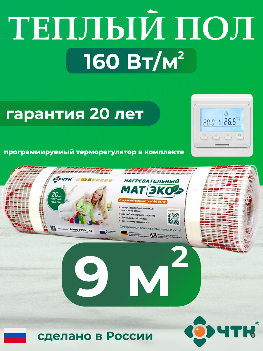 Купить Теплый пол электрический ЧТК 9,0 м2 160 Вт/м2 нагревательный мат ЭКО с программируемым белым терморегулятором в комплекте