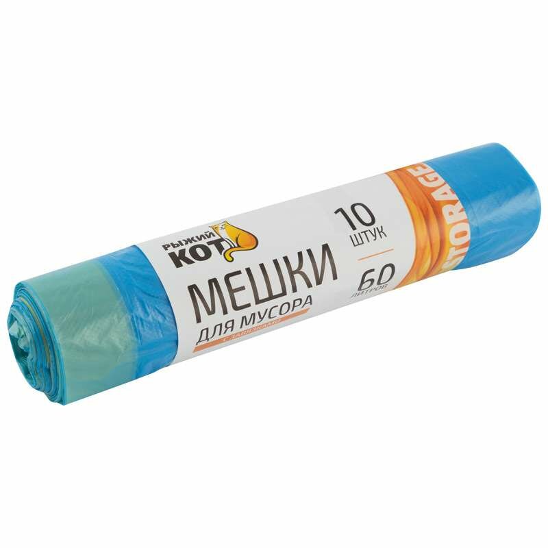 Мешки для мусора Рыжий кот с завязками рулон, 15 мкм, 60 л, рулон 10 шт, синие