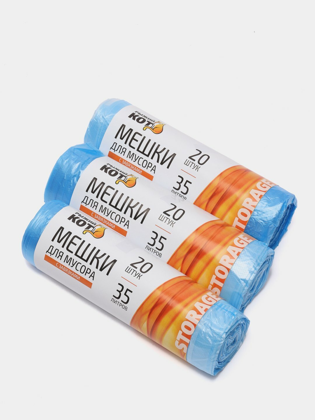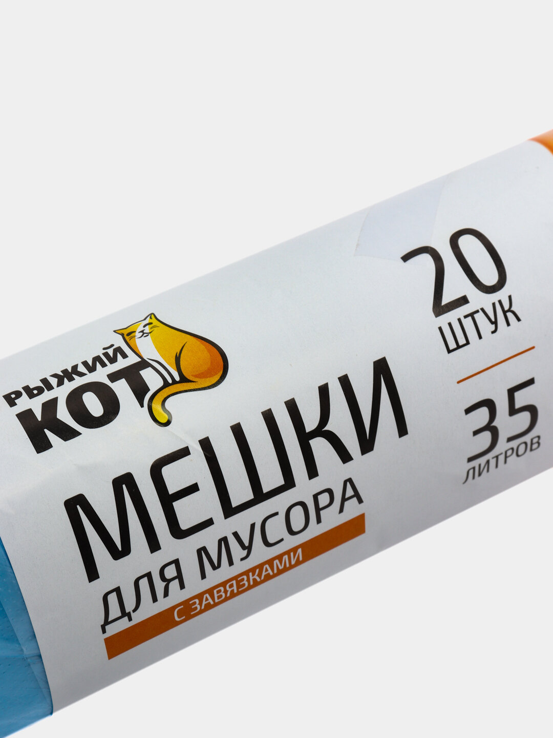 Мешки для мусора Рыжий кот с завязками рулон, 15 мкм, 35 л, рулон 20 шт, синие