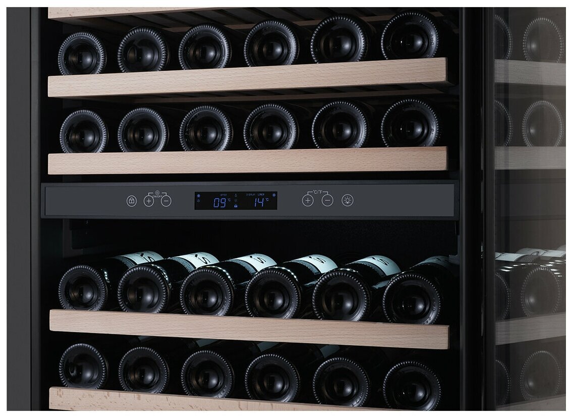 | Плюсы: | 15 полок из дерева, которые беспрепятственно выдвигаются со своих пазов и позволяют хранить до 165 бутылок. Дверь устанавливается с любой удобной стороны. Сенсорное управление температурой. Оптимальный уровень влажности. |