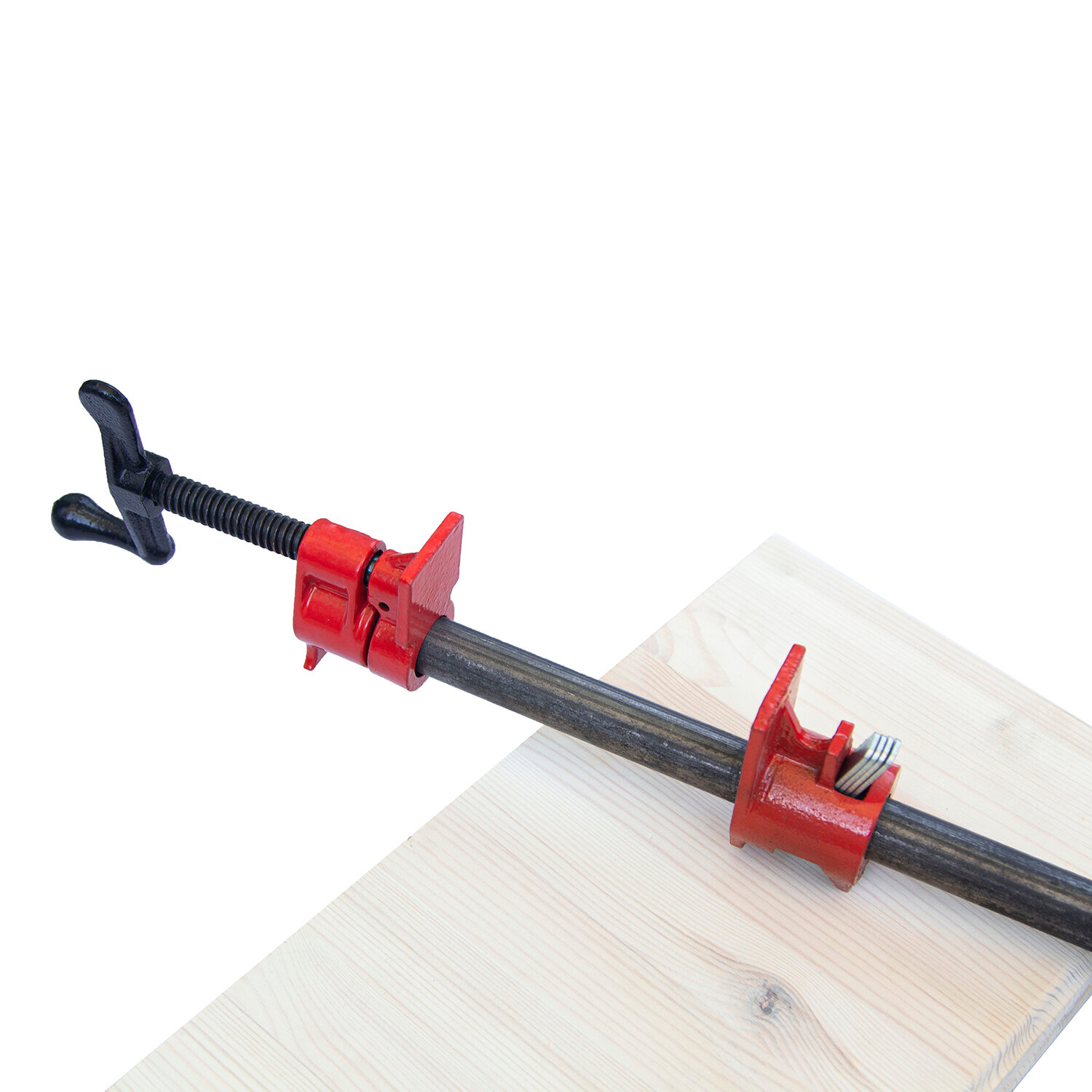 Для использования нужна толстостенная стальная труба с резьбой на одном конце, чтобы зафиксировать неподвижный прижим. |