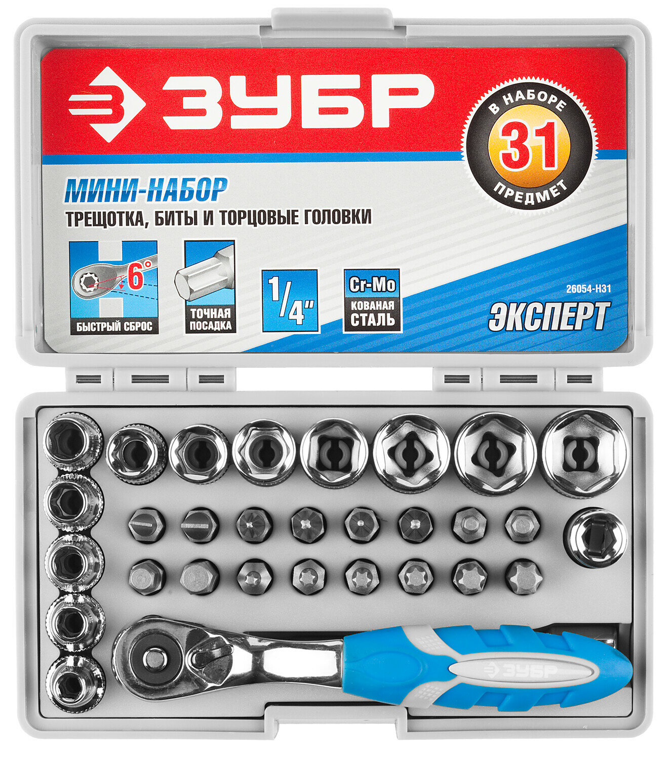 ЗУБР 31 шт., Cr-Mo, набор: трещотка, биты и торцовые головки 26054-H31 Эксперт