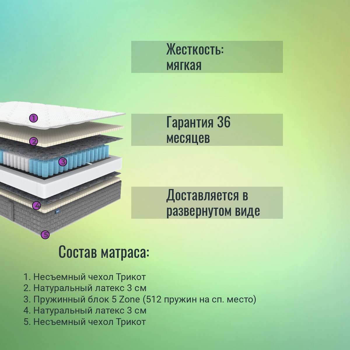 | Отзыв: | Относительно недорогой матрас, если сравнивать с ценами от других производителей. Жесткость низкая, одинаковая со всех сторон. Он анатомический, комфортны для сна. Заранее купили наматрасник, чтобы не испортить верхнюю поверхность матраса. |