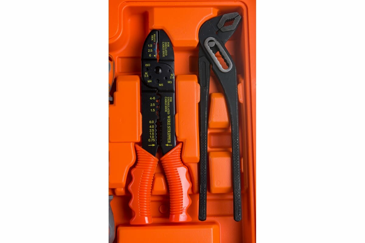 | Дополнительная информация | клещи для обжима и зачистки проводов 215 мм; тиски 250 мм; 26 контактных зажима; индикаторная отвертка |