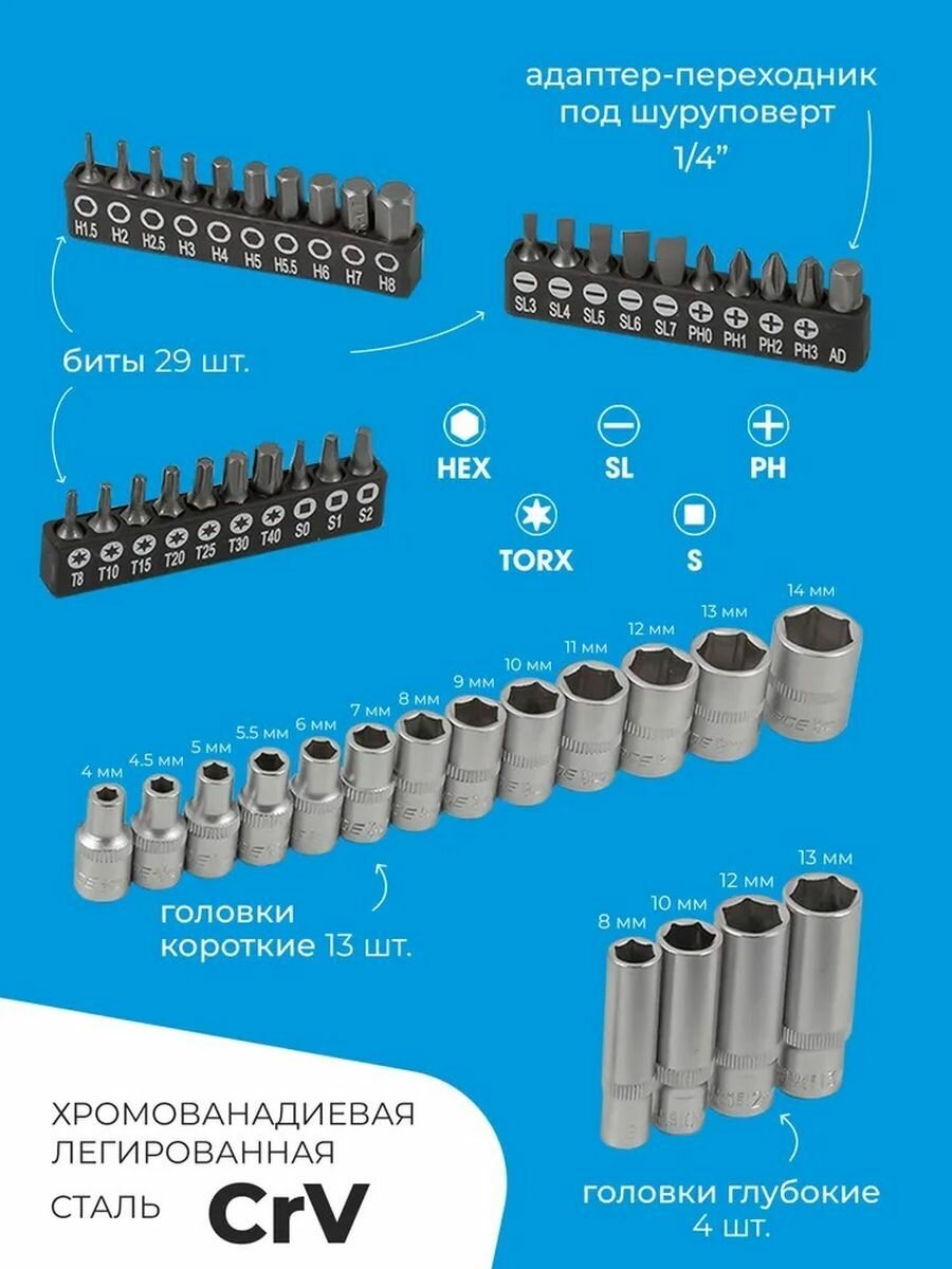 | Головки торцевые подробно | 1/4" (12-гр): 4, 4.5, 5, 5.5, 6, 7, 8, 9, 10, 11, 12, 13, 14 мм; с битами 1/4": H3, H4, H5, H6, H7, H8, T8, T10, T15, T20, T25, T30, T40, SL4, SL5.5, SL7, PH1, PH2, PH3, PZ1, PZ2, PZ3; трещетка 1/4": 24 зуба; вороток т-образный 1/4"; удлинитель 1/4": 50, 100 мм; гибкий удлинитель 1/4": 145 мм; карданный шарнир 1/4" |