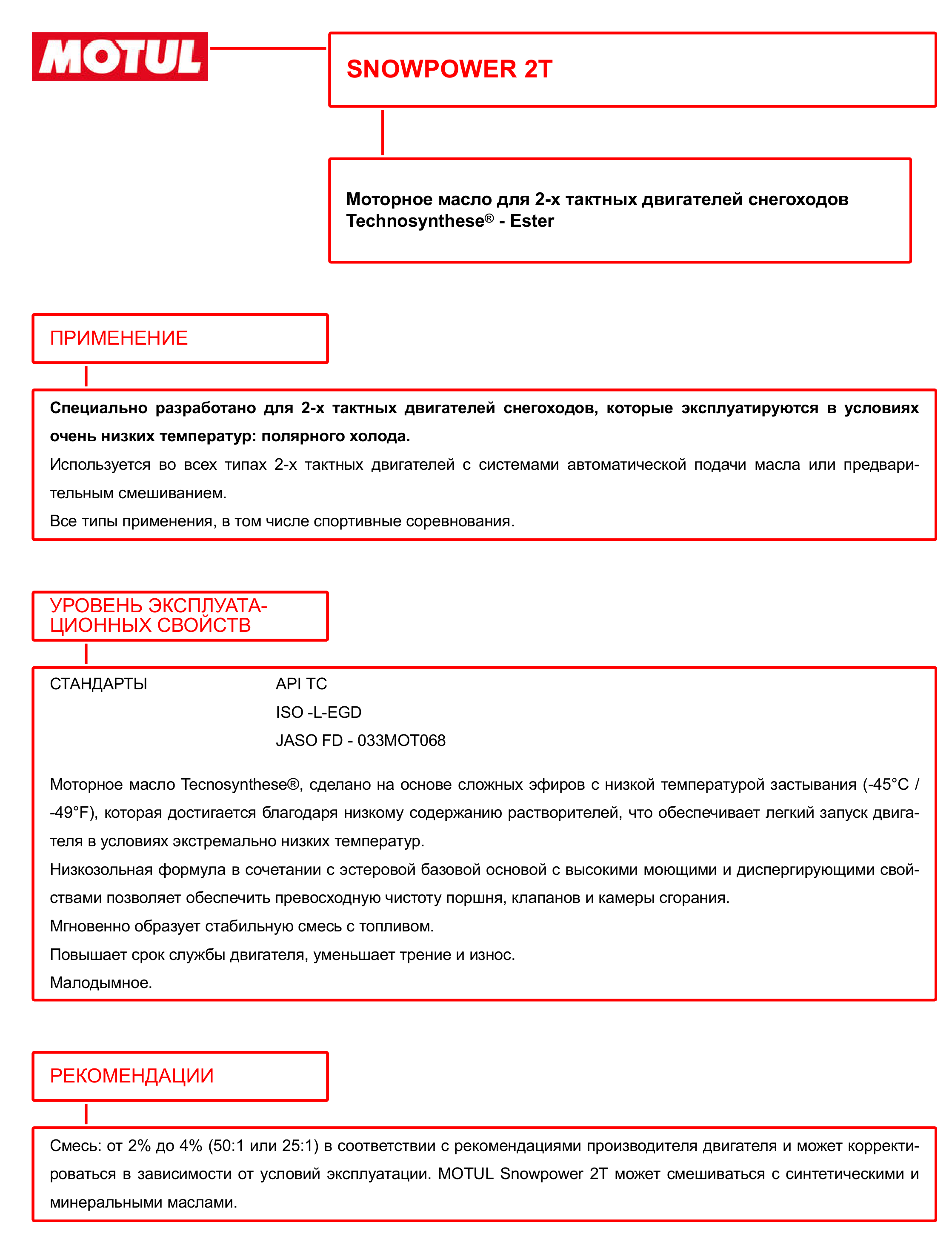 Приемлемая цена, отличное качество, двигатель резво запускается даже при минус 30 (ниже не проверял), производитель утверждает что даже при 45 легко заведется Недостатки: Я не нашел в нем недостатков Моторное масло для снегоходов (и не только) с 2-х тактным двигателем. |