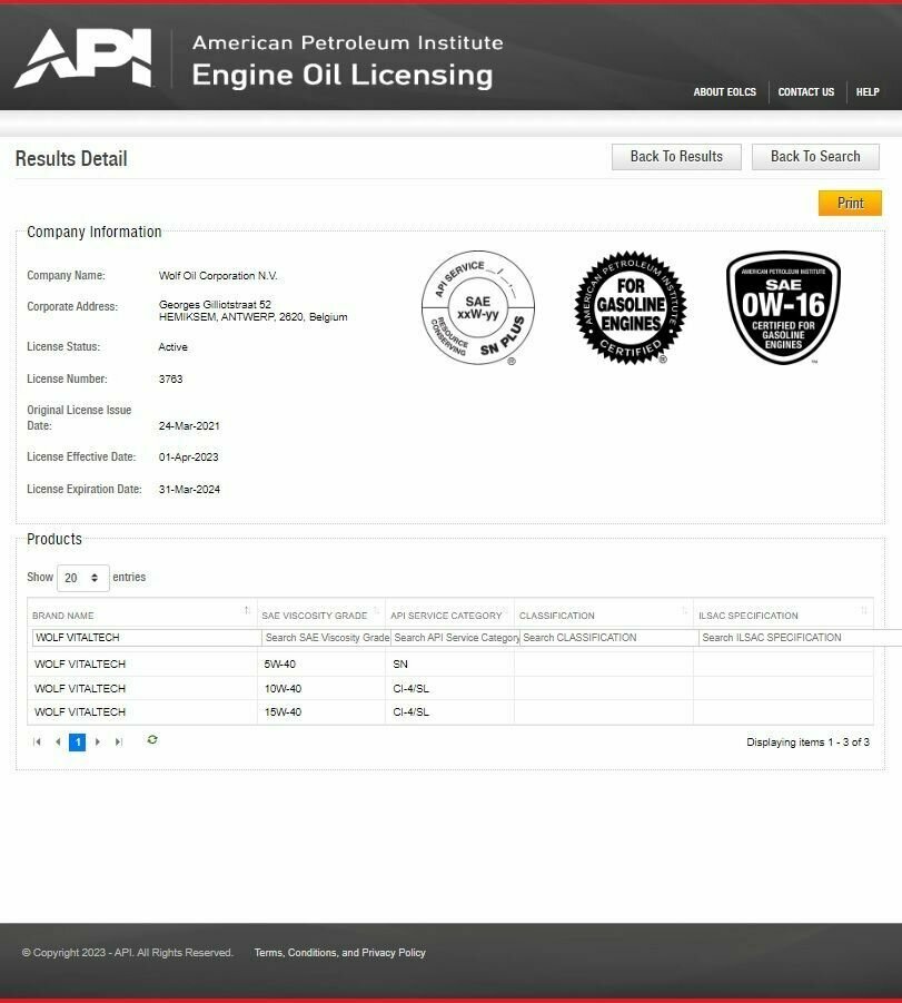 WOLF OIL 8312090 Масло моторное синтетическое VITALTECH 5W40 API SN/CF ACEA A3/B4 205л
