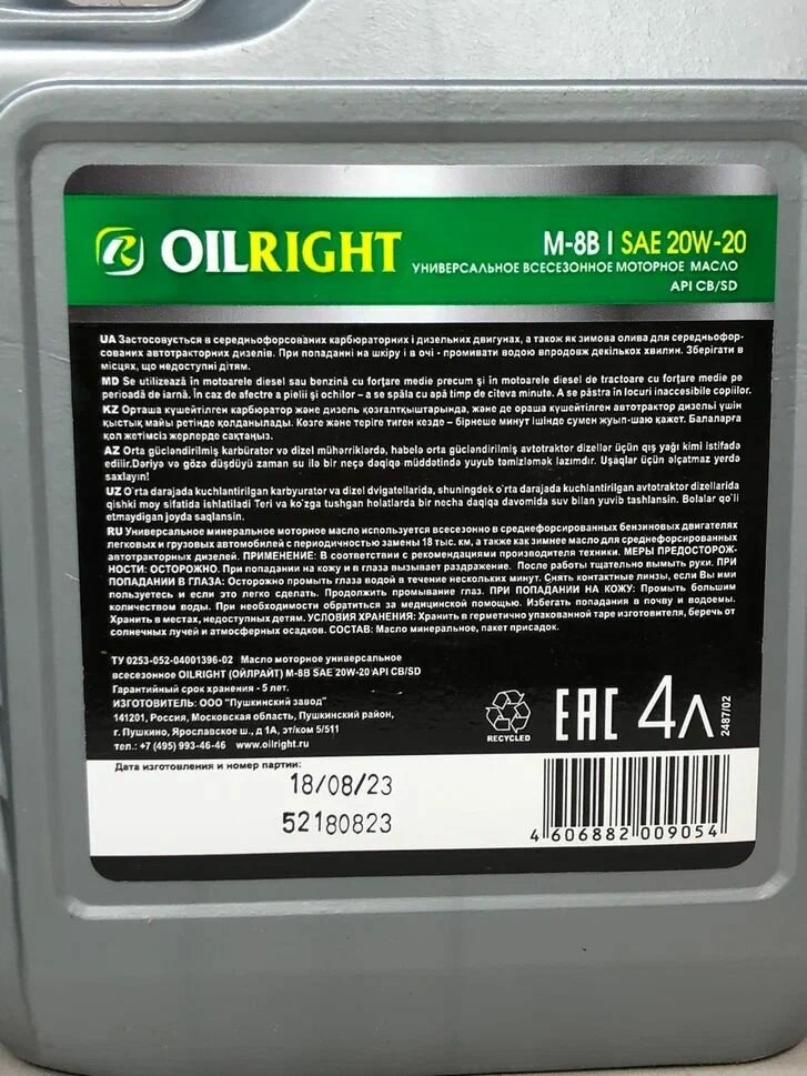 Минеральное моторное масло OILRIGHT М-8В SAE 20W-20, 4 л