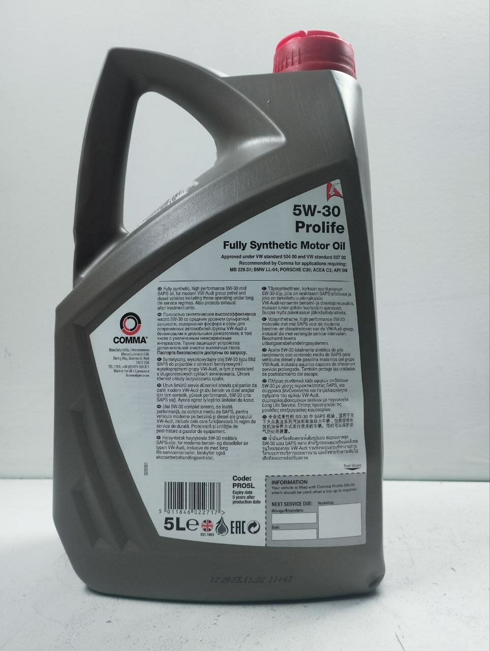 COMMA PRO5L COMMA 5W30 PROLIFE (5L)_масло мот.!син.\ ACEA C3, VW 504 00/507 00, MB 229.51, BMW LL-04,PORSCHE C30