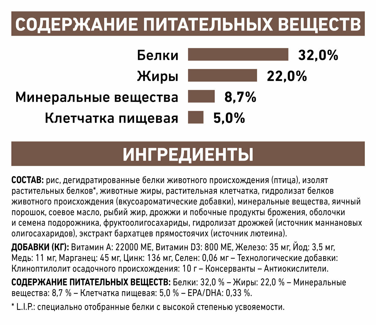 | Состав | изолят растительных белков, дегидратированные белки животного происхождения (птица), рис, пшеница, животные жиры, растительная клетчатка, гидролизат белков животного происхождения (вкусоароматические добавки), мука из зерновых культур, рыбий жир, соевое масло, минеральные вещества, дрожжи и побочные продукты брожения, фруктоолигосахариды, гидролизат дрожжей (источник мaннановых олигосахаридов), масло огуречника аптечного, экстракт бархатцев прямостоячих (источник лютеина), гидролизат из панциря ракообразных (источник глюкозамина), гидролизат из хряща (источник хондроитина) |