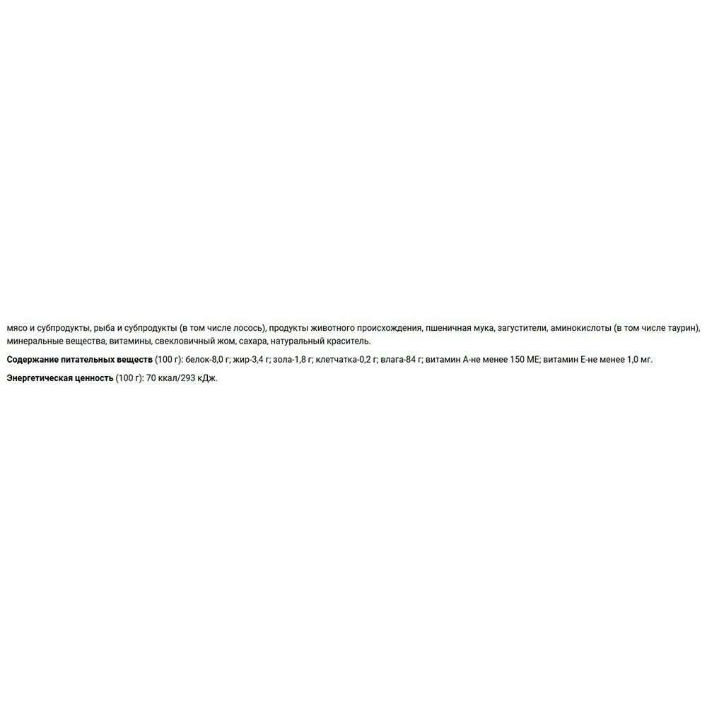 | Состав | мясо и субпродукты (в том числе курица), продукты животного происхождения, пшеничная мука, загустители, аминокислоты (в том числе таурин), минеральные вещества, витамины, свекловичный жом, сахара, натуральные красители. |