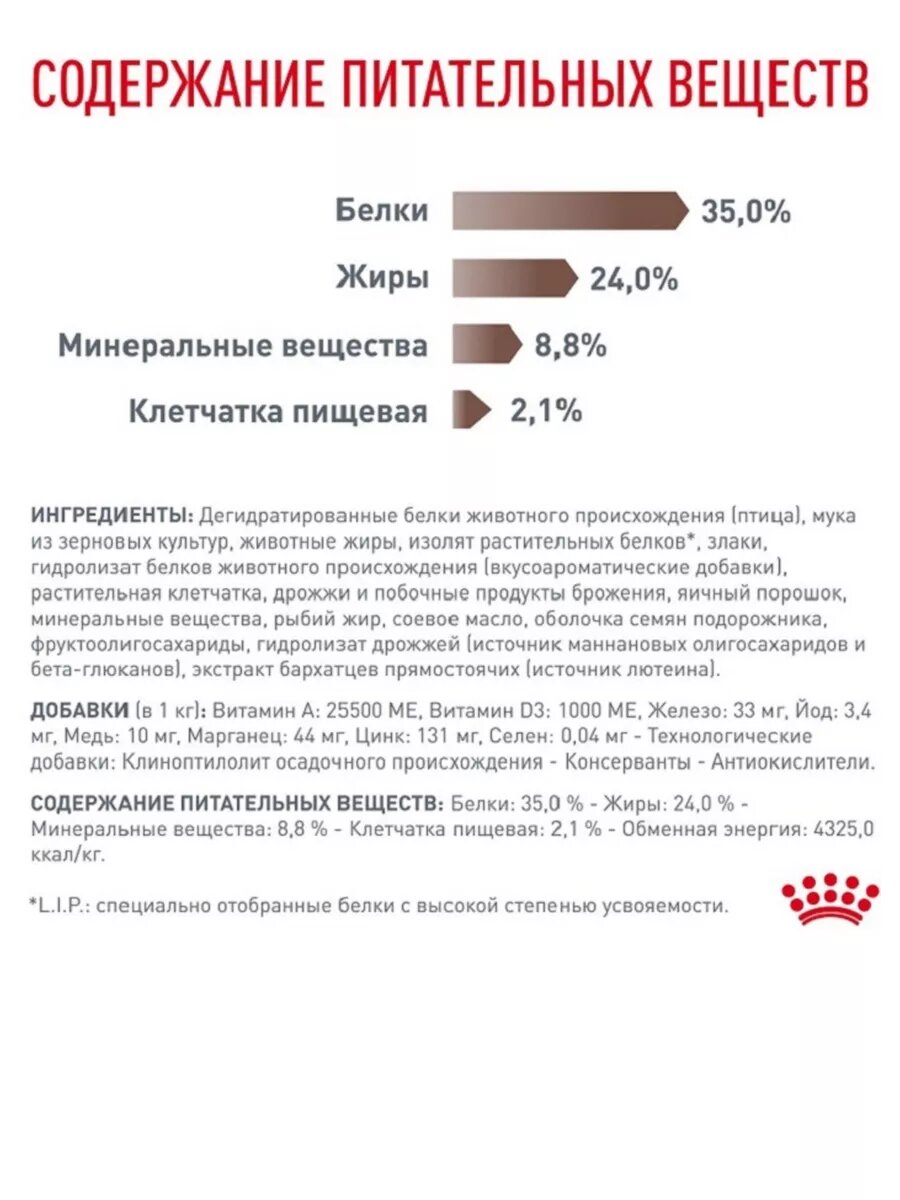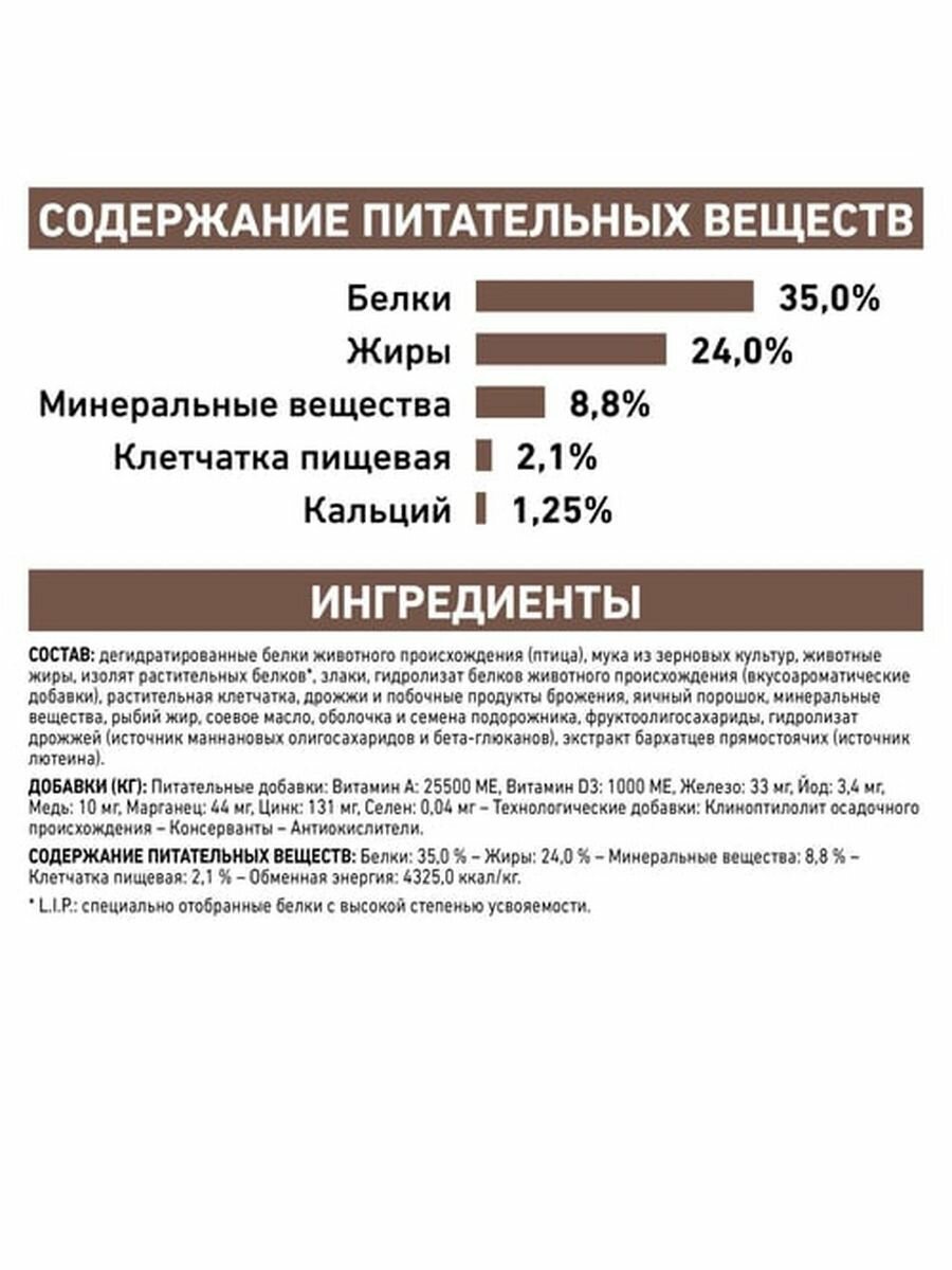 | Состав | рис, дегидратированные белки животного происхождения (птица), изолят растительных белков, животные жиры, растительная клетчатка, гидролизат белков животного происхождения (вкусоароматические добавки), минеральные вещества, яичный порошок, соевое масло, рыбий жир, дрожжи и побочные продукты брожения, оболочка и семена подорожника, фруктоолигосахариды, гидролизат дрожжей (источник мaннановых олигосахаридов), экстракт бархатцев прямостоячих (источник лютеина) |