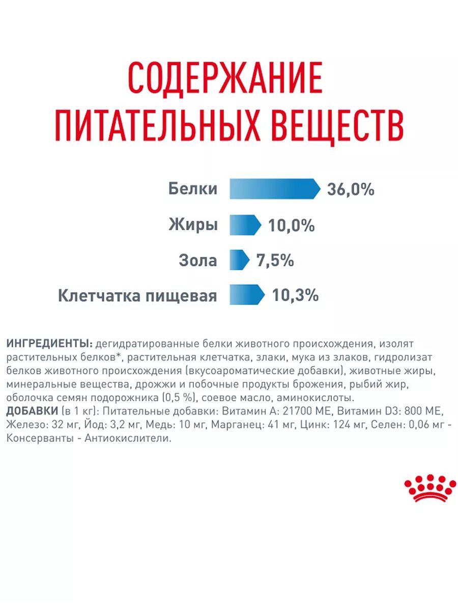 | Состав | дегидратированное мясо птицы, кукуруза, изолят растительных белков, кукурузная клейковина, пшеница, животные жиры, растительная клетчатка, гидролизат белков животного происхождения, свекольный жом, минеральные вещества, соевое масло, масло огуречника аптечного |