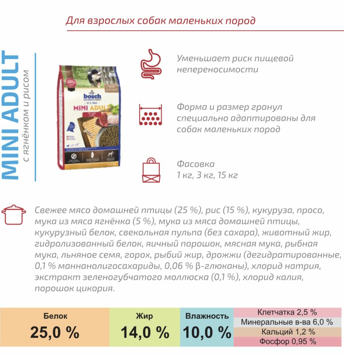 | Состав | свежее мясо домашней птицы (25 %), рис (15 %), кукуруза, просо, мука из мяса ягнёнка (5 %), мука из мяса домашней птицы, кукурузный белок, свекольная пульпа (без сахара), животный жир, гидролизованный белок, яичный порошок, мясная мука, рыбная мука, льняное семя, горох, рыбий жир, дрожжи (дегидратированные, 0,1 % маннанолигосахариды, 0,06 % β-глюканы), хлорид натрия, экстракт зеленогубчатого моллюска (0,1 %), хлорид калия, порошок цикория |