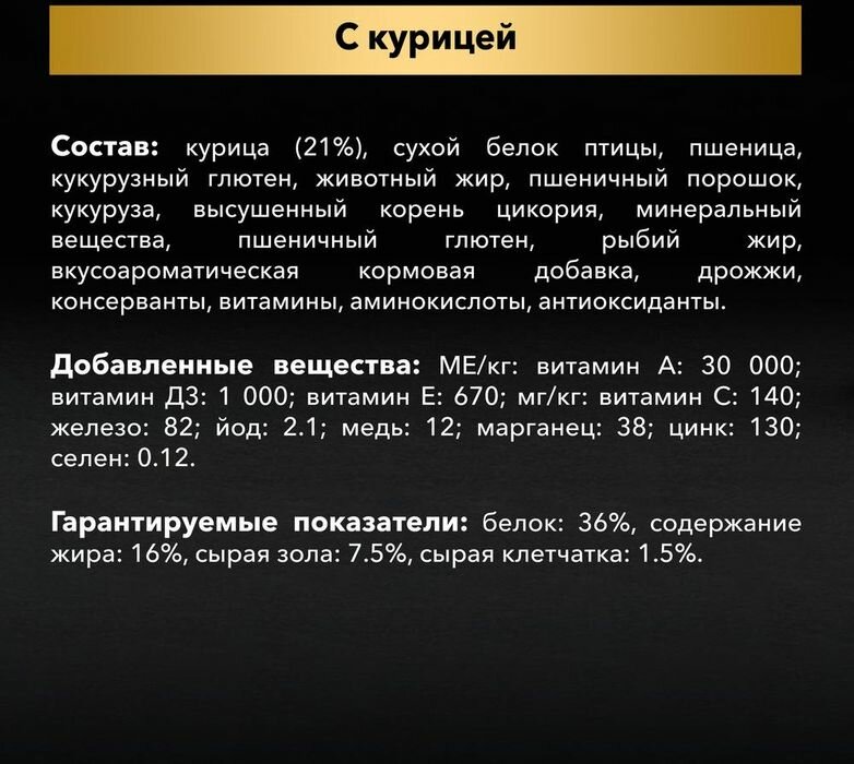 | Состав | курица (21%), сухой белок птицы, пшеница, рис, кукурузный глютен, животный жир, яичный порошок, сухой корень цикория, кукуруза, пшеничный глютен, минеральные вещества, рыбий жир, вкусоароматическая кормовая добавка, дрожжи, консерванты, витамины, антиоксиданты |