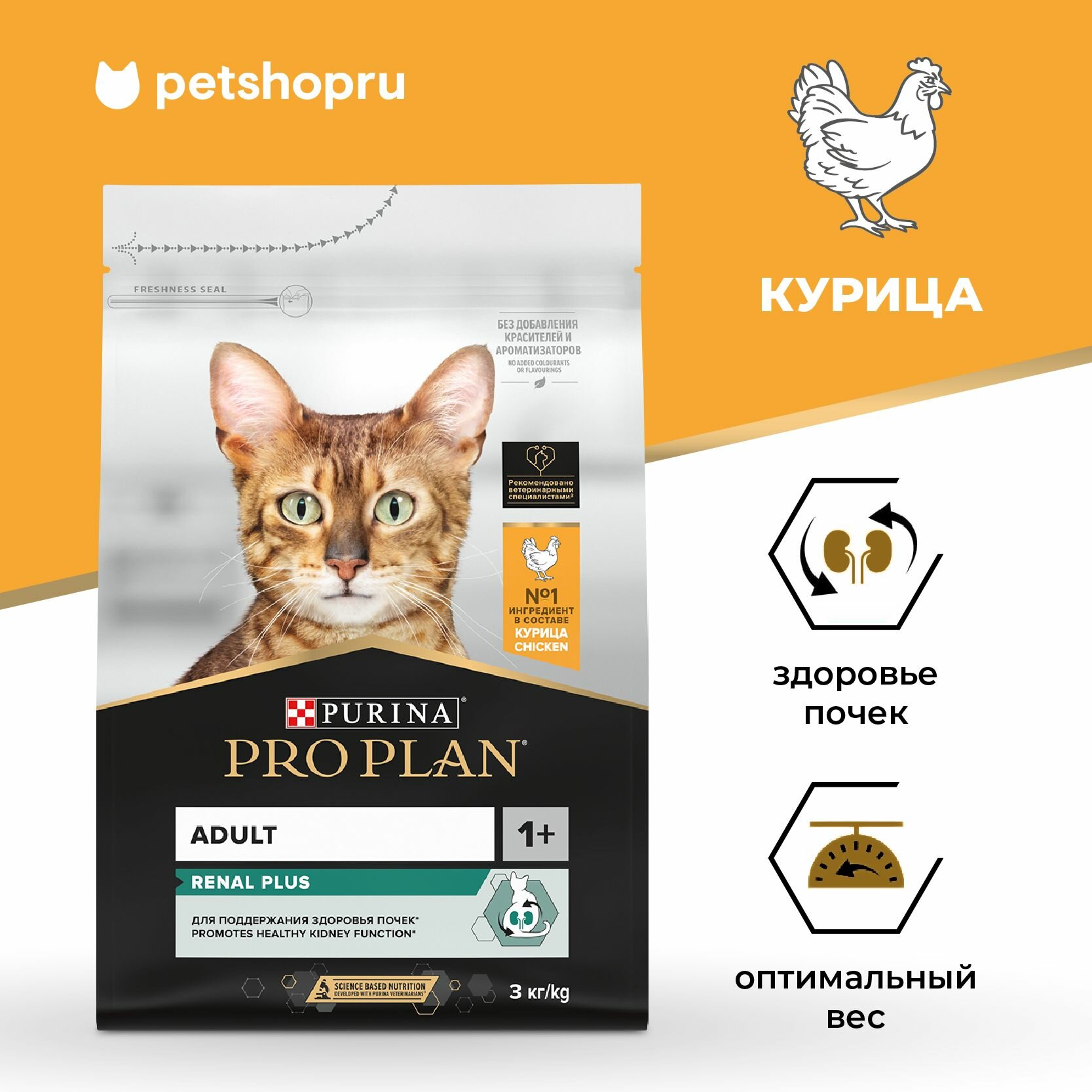 Сухой корм PRO PLAN® для взрослых кошек для поддержания здоровья почек, с высоким содержанием курицы, RENAL PLUS,3 кг