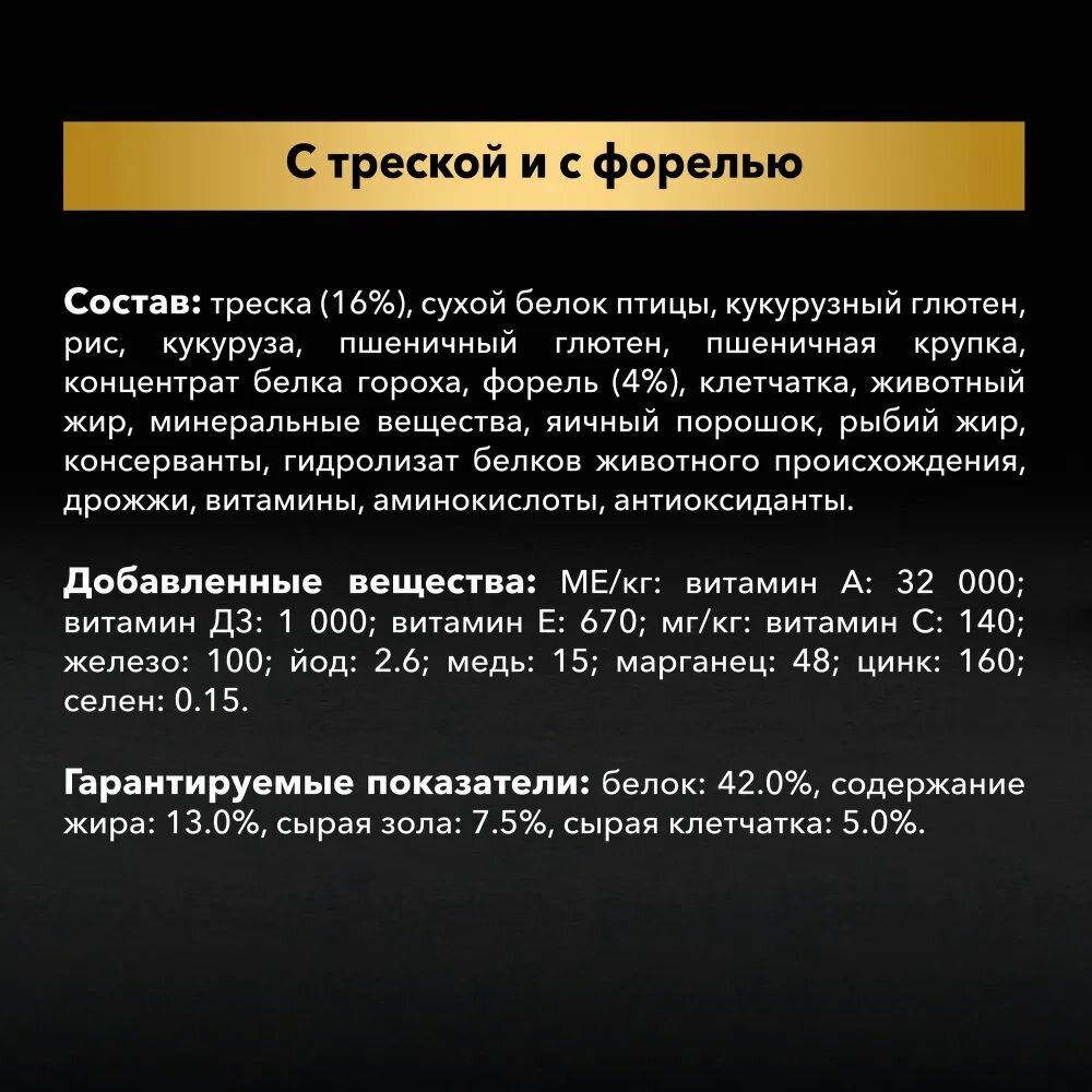 | Дополнительная информация | рекомендации по кормлению, позволяющие поддерживать идеальную форму, могут варьироваться в зависимости от возраста животного, его активности и условий окружающей среды; следите за весом вашей кошки и корректируйте количество даваемого корма; следите, чтобы у вашей кошки всегда была чистая свежая питьевая вода; для здоровья вашей кошки регулярно консультируйтесь с ветеринарным врачом |