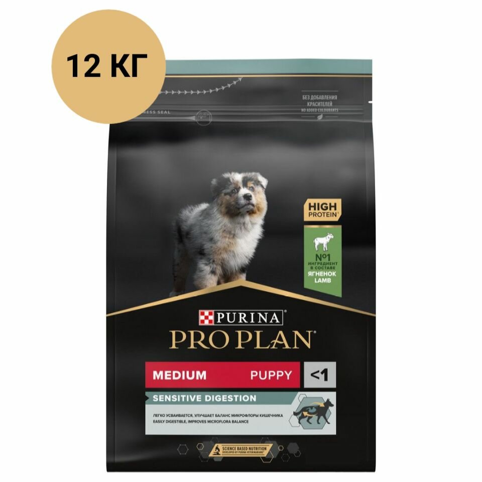 Корм Purina Pro Plan для щенков средних пород с чувствительным пищеварением, с ягненком, 12 кг