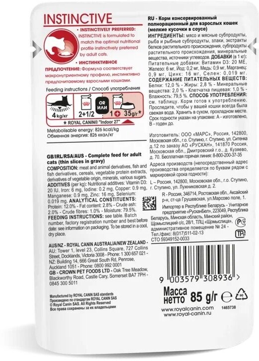 Влажный корм для кошек Royal Canin INSTINCTIVE (инстинктив) Мелкие кусочки в cоусе исключительной аппетитности для взрослых кошек в возрасте от 1 года до 7 лет 85 г х 24 шт