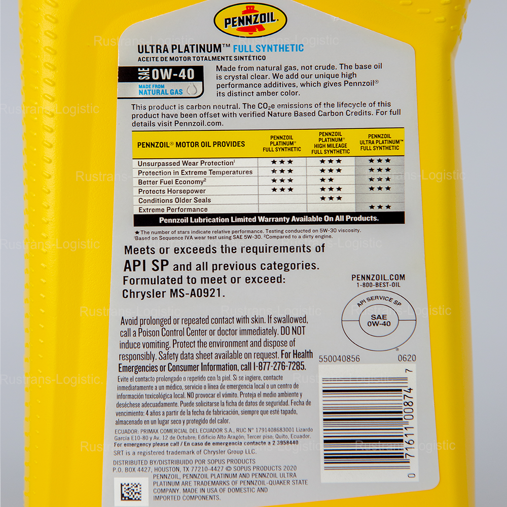 Купить PENNZOIL 550040856 Масо моторное синтетическое PENNZOIL ULTRA PLATINUM Full Synthetic 0W-40 SRT Motor Oil (946 м)