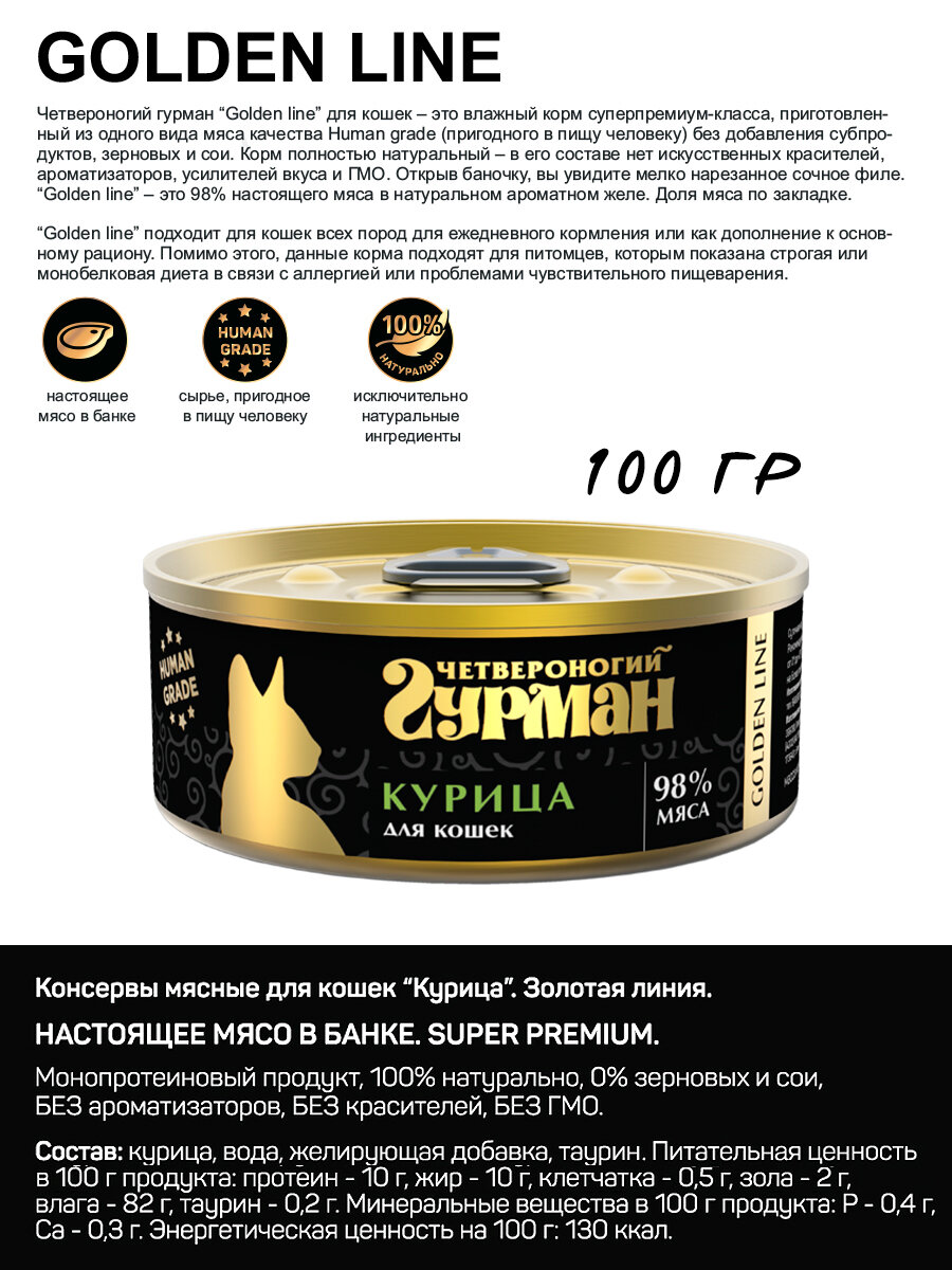 Четвероногий Гурман Золотая линия влажный корм для взрослых кошек, индейка натуральная в желе 100 гр (2 шт)