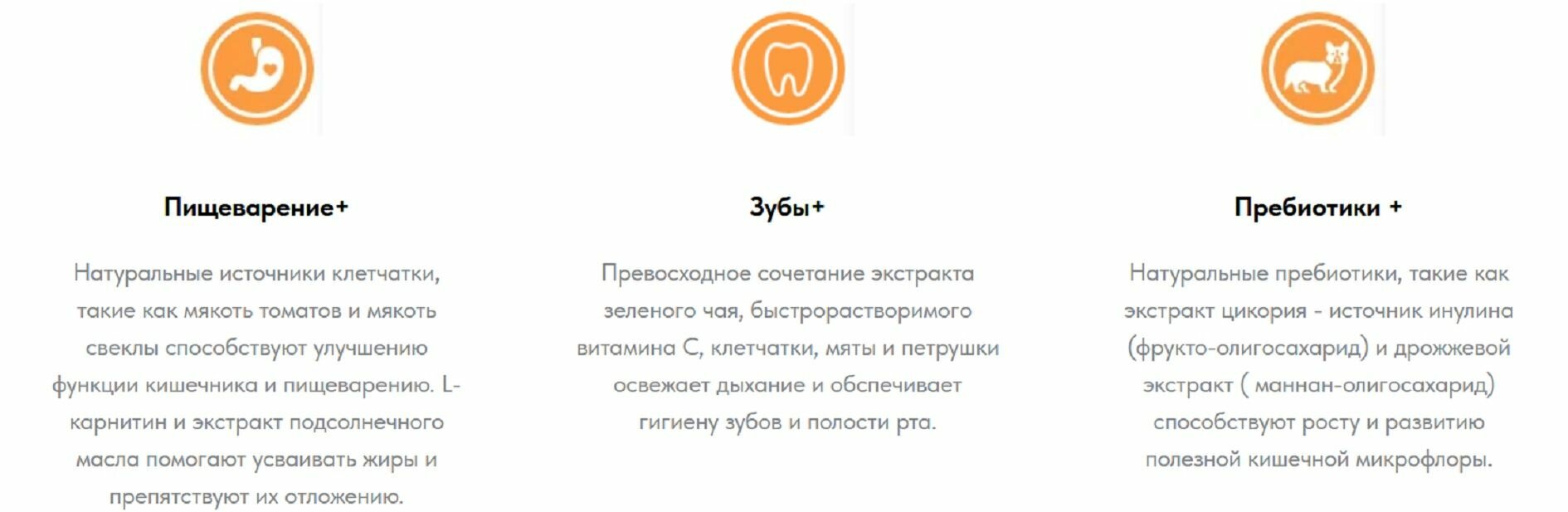 | Состав | мука из мяса курицы, дробленый рис, перловая крупа, овсяная крупа, куриный жир (источник жирных кислот Омега-6), в качестве консерванта — смесь токоферолов,(источник витамина Е), сушеная мякоть свеклы, измельченная клетчатка, сушеная мякоть томатов, гидролизат куриной печени, цельное семя льна, лецитин, хлорид калия, соль, холинхлорид, кальция пропинат (в качестве консерванта), дрожжевой экстракт, аскорбиновая кислота (витамин С),таурин, экстракт цикория (источник инулина), сульфат железа,оксид цинка, ацетат ɑ-токоферола (источник витамина Е),экстракт Юкки Шидигера, протеинат железа,протеинат цинка, селенит натрия, мононитрат тиамина, мука из водорослей, экстракт зеленого чая, сушеная мята, сушеная петрушка, L-карнитин, экстракт подсолнечного масла, сульфат меди, йодат кальция, пиридоксина гидрохлорид, оксид марганца, протеинат марганца, никотиновая кислота, d-пантотенат кальция, супплемент витамина A, протеинат меди, холикальцеферол (витамин D3), фолиевая кислота, рибофлавин, бисульфат менадиона никотинамида (витамин K3), биотин, супплемент витамина В12, карбонат кобальта |