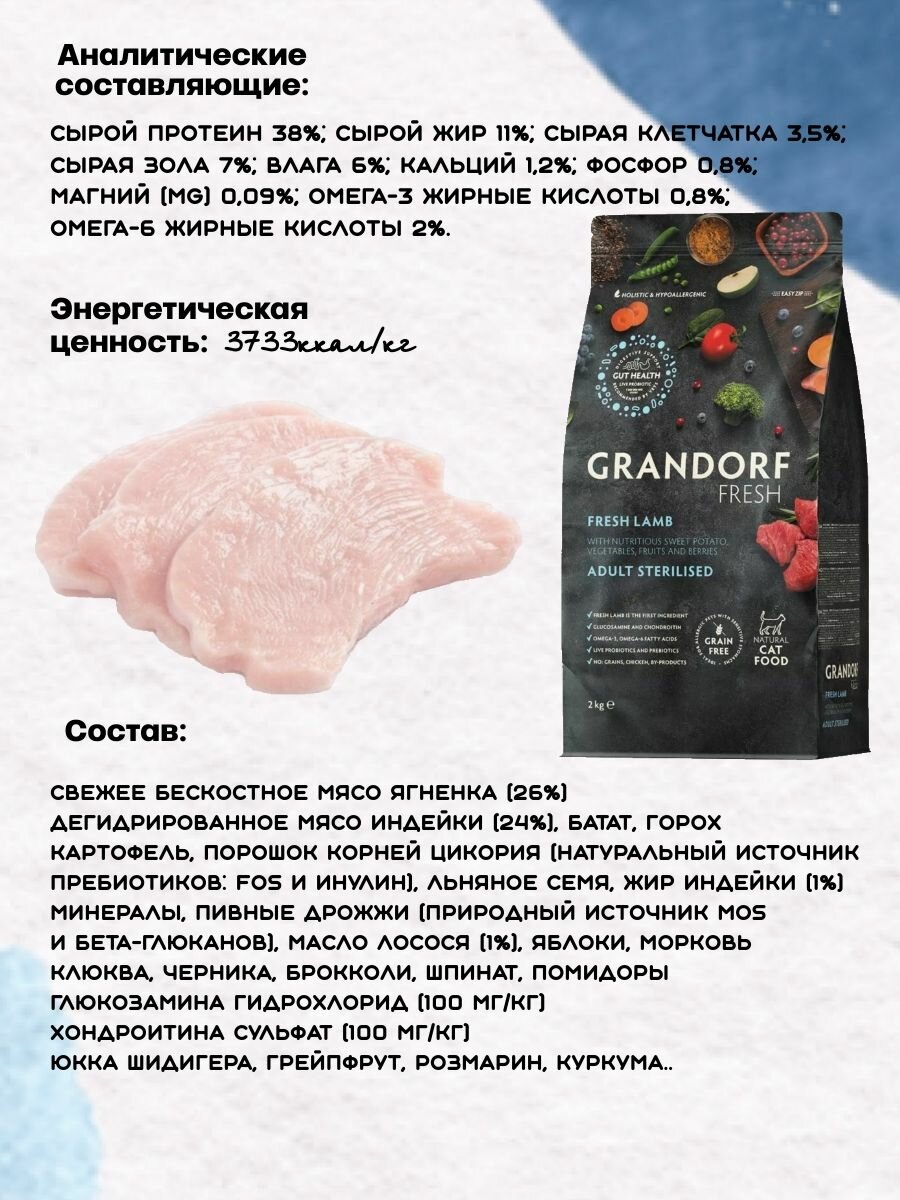 Сухой беззерновой корм Grandorf Fresh 2кг свежее мясо ягненка с бататом, с живыми пробиотиками для взрослых стерилизованных кошек с чувствительным пищеварением или склонных к аллергии