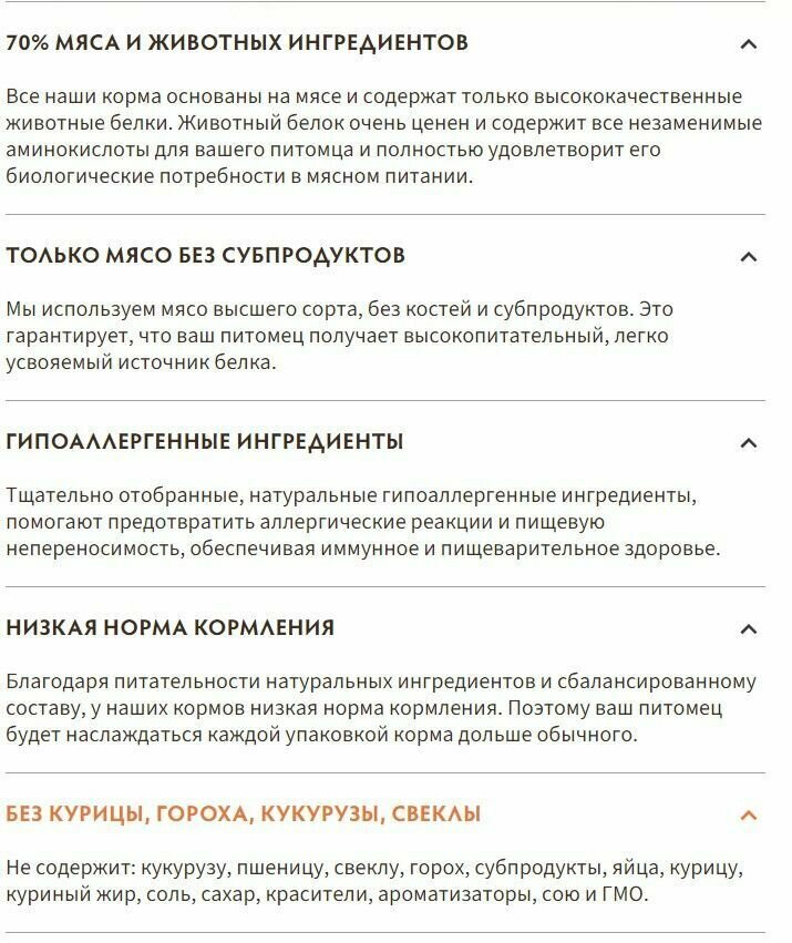 | Дополнительная информация | не содержит: кукурузу, пшеницу, свеклу, горох, субпродукты, яйца, курицу, куриный жир, соль, сахар, красители, ароматизаторы, сою и гмо; страна производитель: Бельгия |