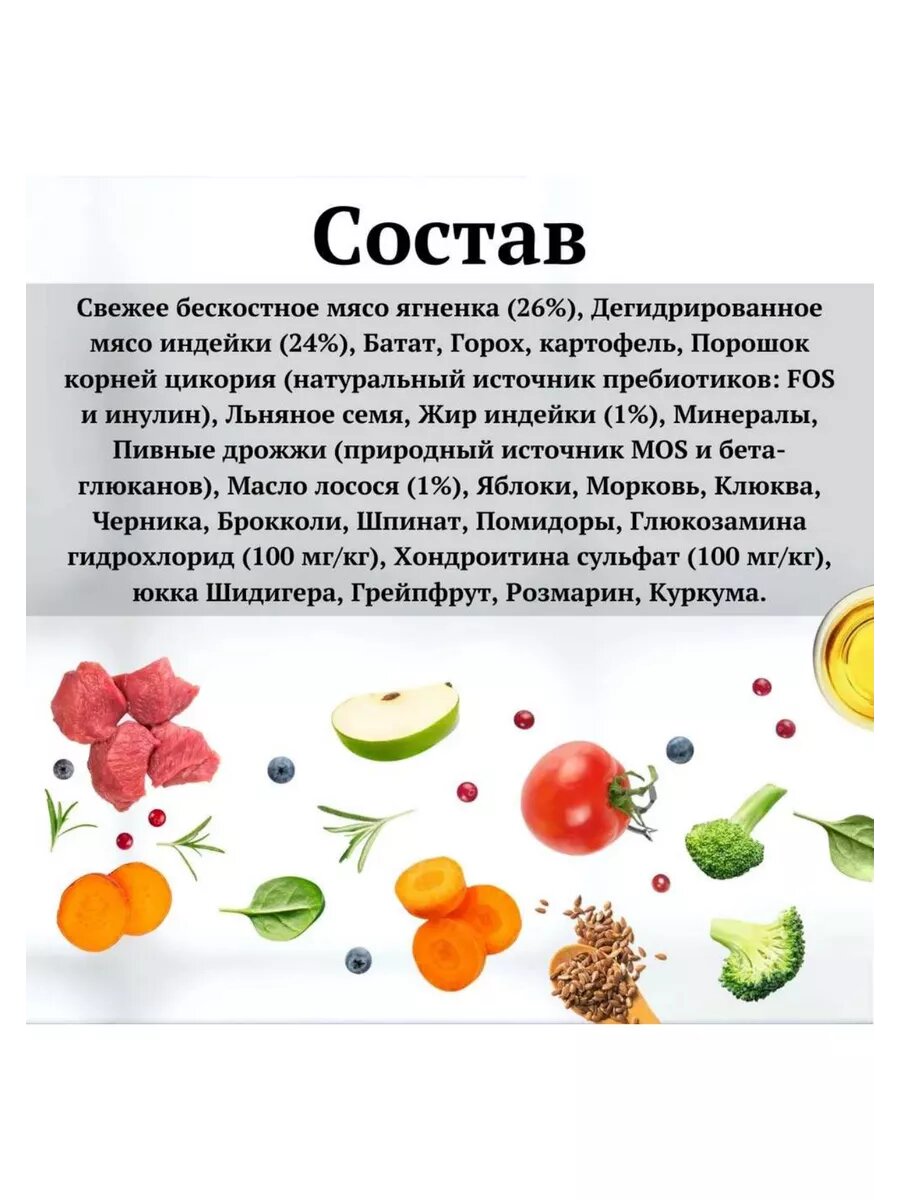 | Состав | дегидрированное мясо кролика, дегидрированное мясо индейки, цельный рис, свежее мясо кролика, свежее мясо индейки, жир индейки, сушеный цикорий (естественный источник FOS и инулина), сушеный сладкий картофель (батат), пивные дрожжи (естественный источник MOS), сушеный антарктический криль (естественный источник EPA и DHA), сушеная морковь, семена льна, пищевые волокна, таурин, сушеная клюква, Юкка Шидигера, L-карнитин, комплекс натуральных антиоксидантов (экстракт розмарина, куркумы, цитрусовых и сигизиума). Сохранено витамином С, розмарином и смесью природных токоферолов (источник натурального витамина Е) |