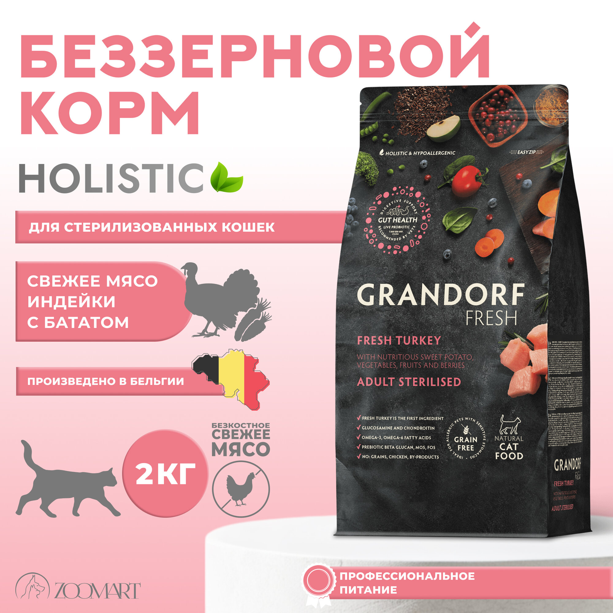 Корм сухой Grandorf Fresh , беззерновой с живыми пробиотиками, свежее мясо индейки с бататом для стерилизованных кошек, 2 кг