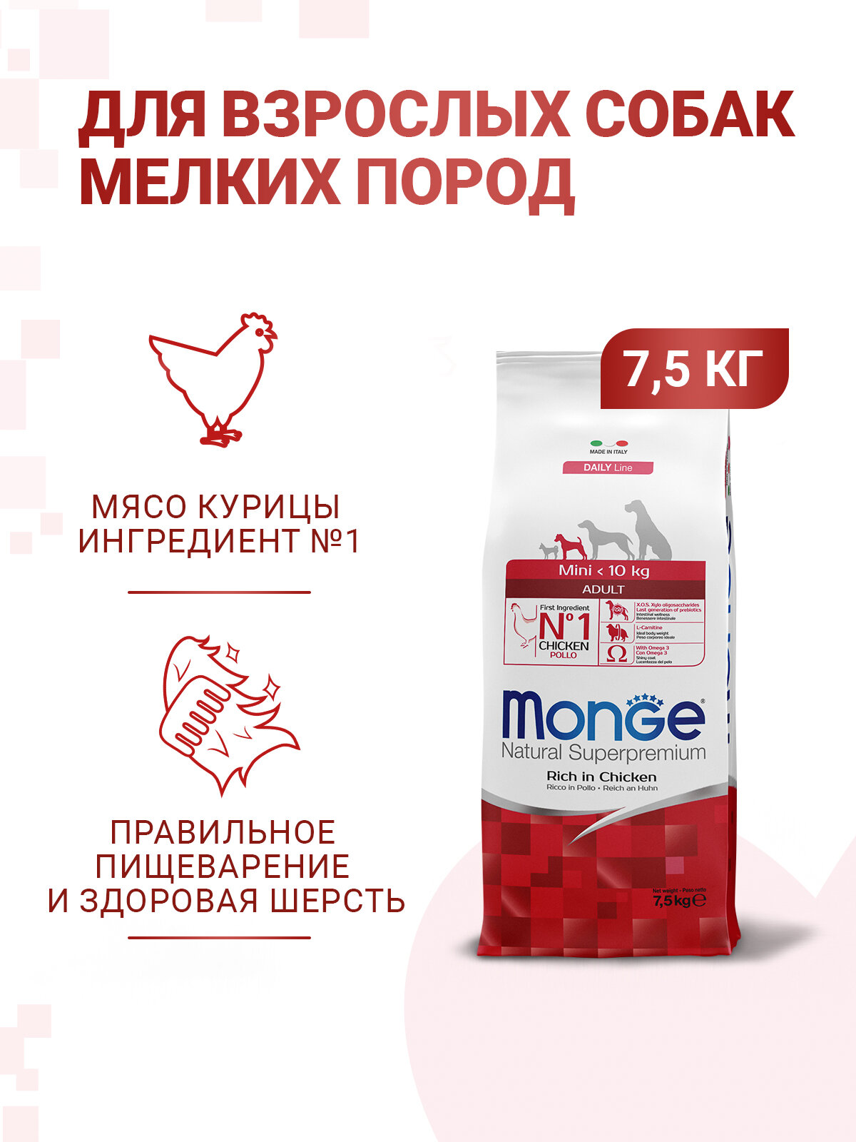 Сухой корм Monge Dog Daily Line Mini для взрослых собак мелких пород, из курицы 7,5 кг