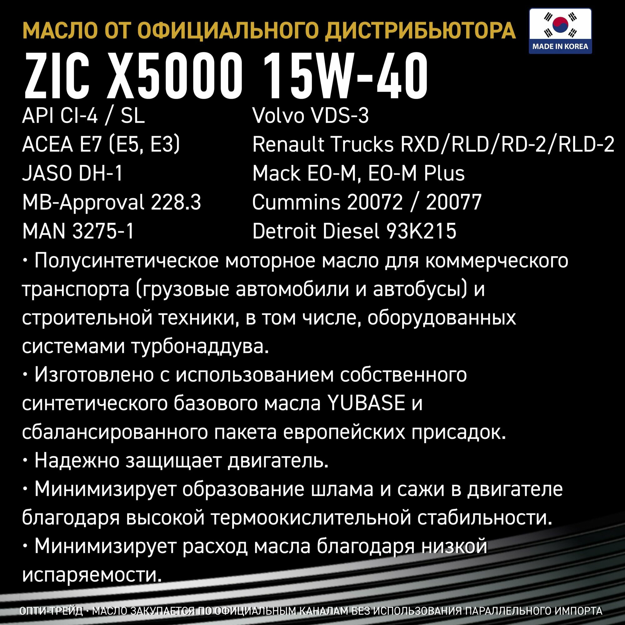 Zic 15w40 (20l) x5000_масло мот.!полусинт.\acea e7, a3/b4, mb 228.3, vds-3, man3275, cum 20072/20077, zic, 192604