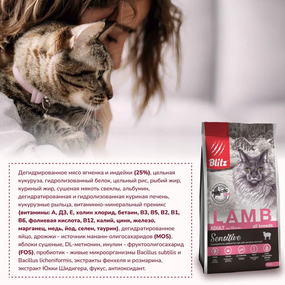 Сухой корм Blitz для кошек ягненок sensitive lamb adult cats all breeds 400г 680214