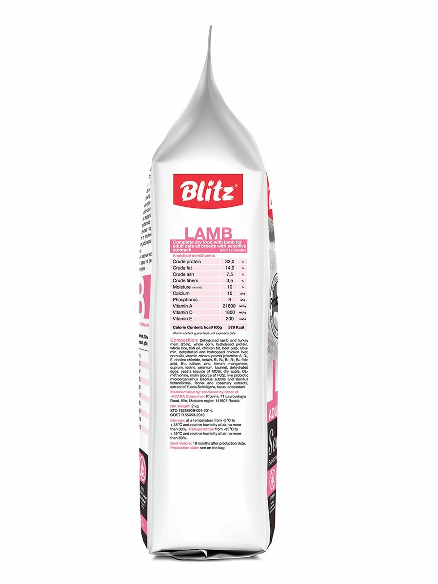 BLITZ сух. корм д/взрослых кошек Ягненок 2кг