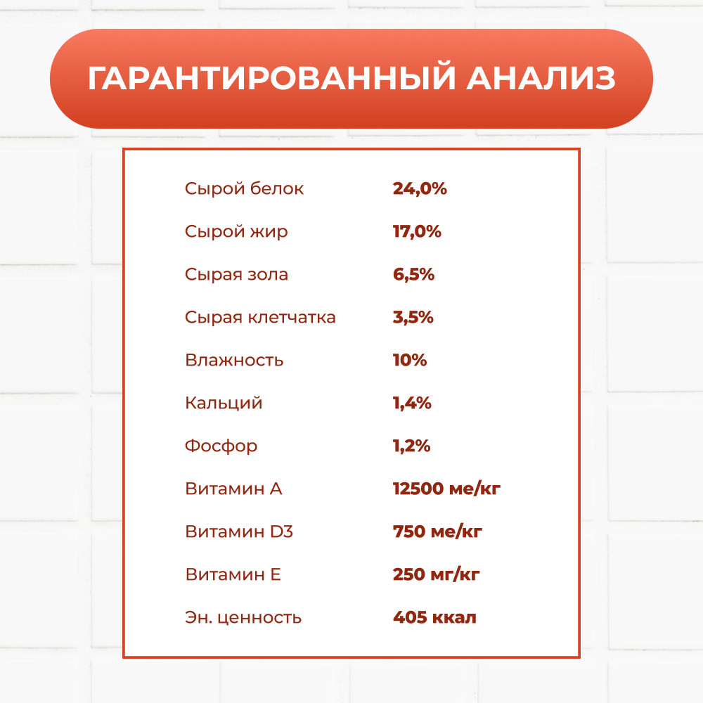 | Витамины | А, Д3, Е, холин хлорид, бетаин, В3, В5, В2, В1, В6, фолиевая кислота, В12 |