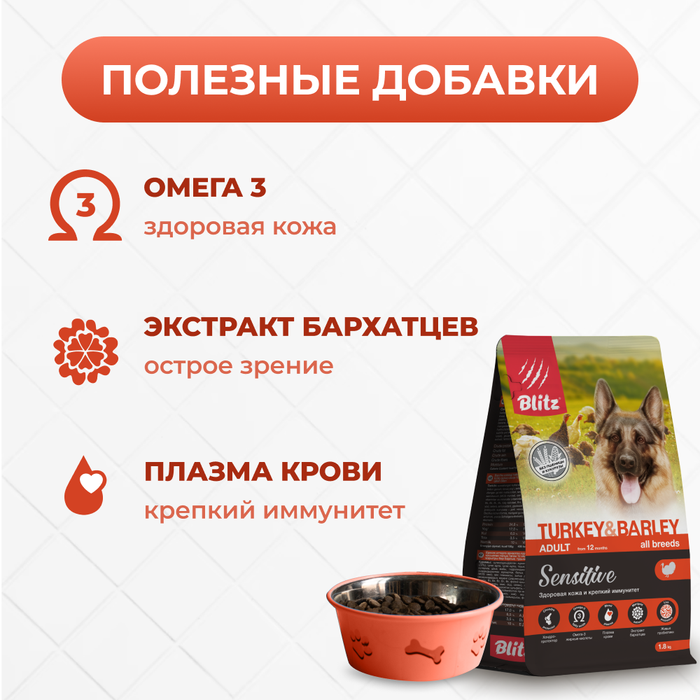 Сухой корм BLitz Sensitive Turkey & Barley Adult Dog All Breeds для взрослых собак всех пород с индейкой и ячменем, 15кг.