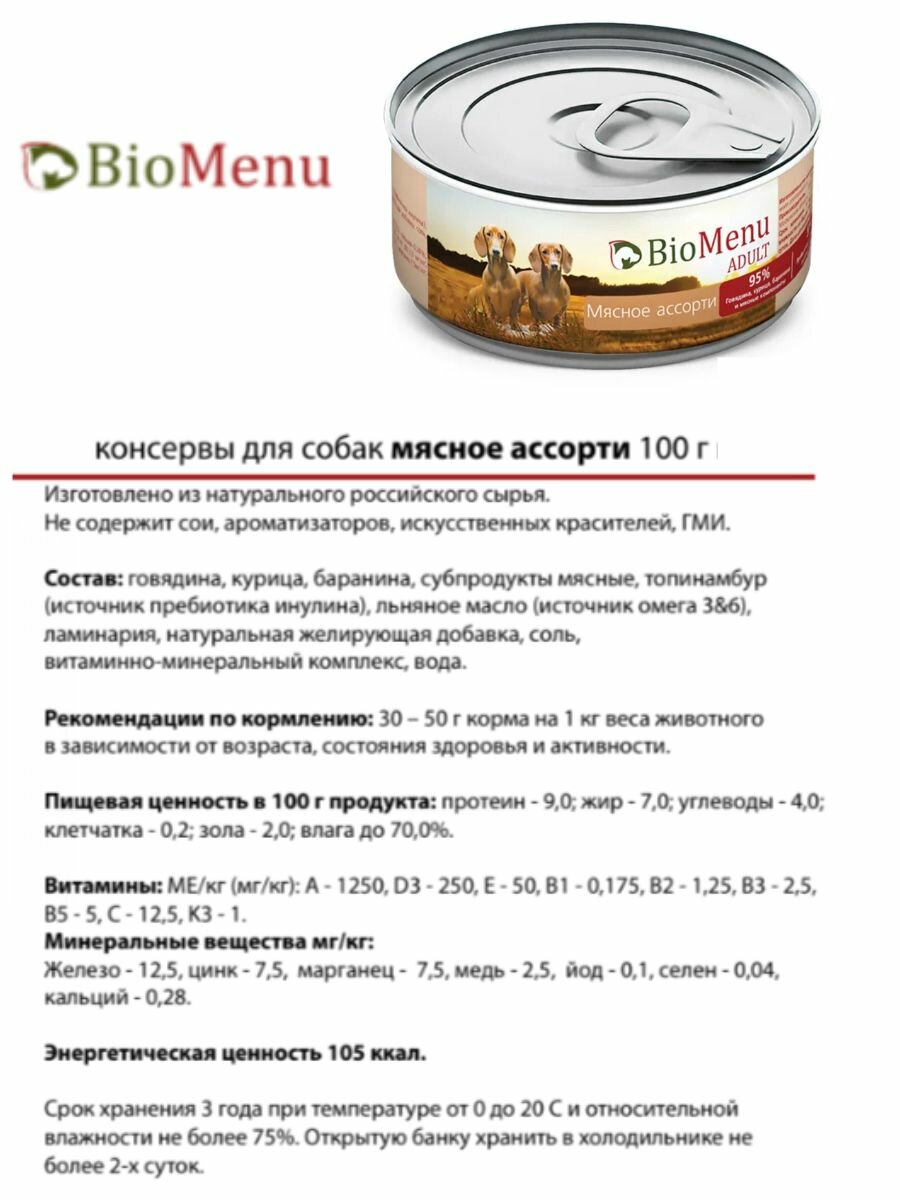 BioMenu ADULT Консервы для собак Мясное ассорти 95%-мясо 100г - 24 шт