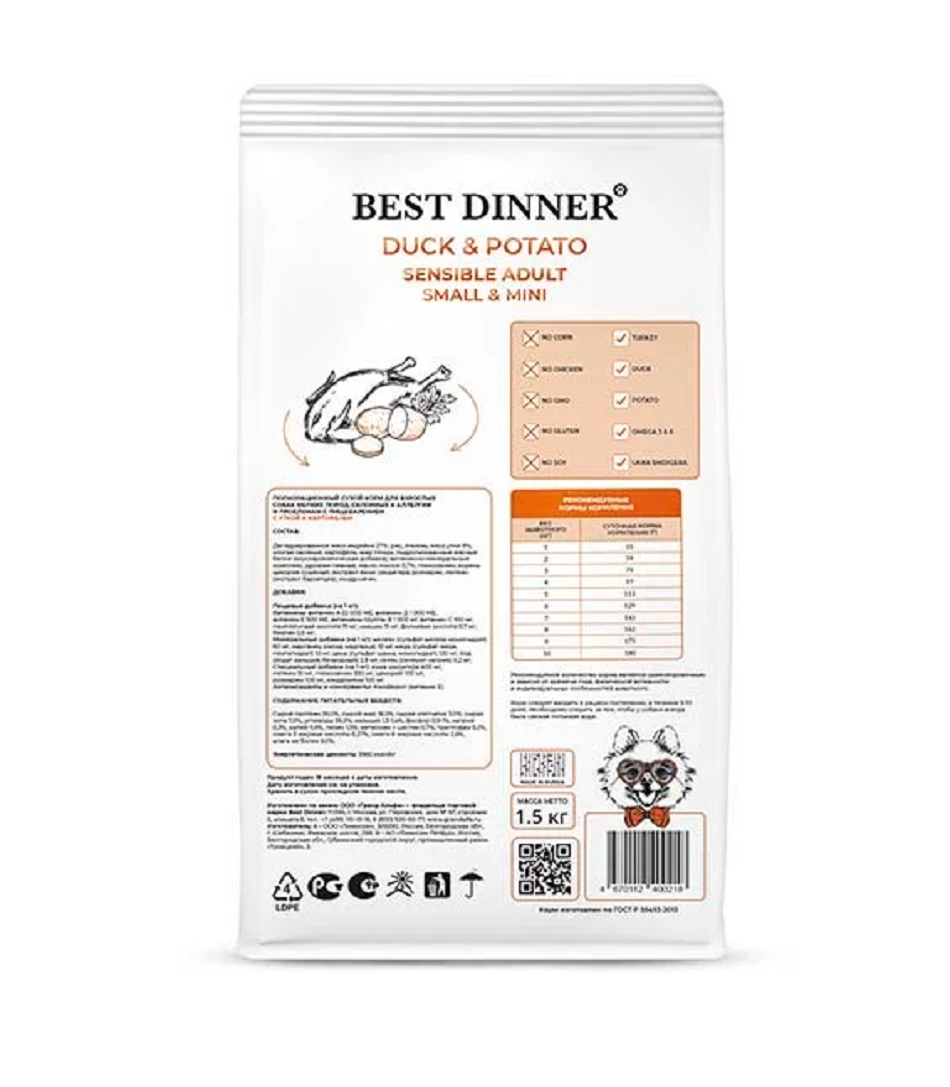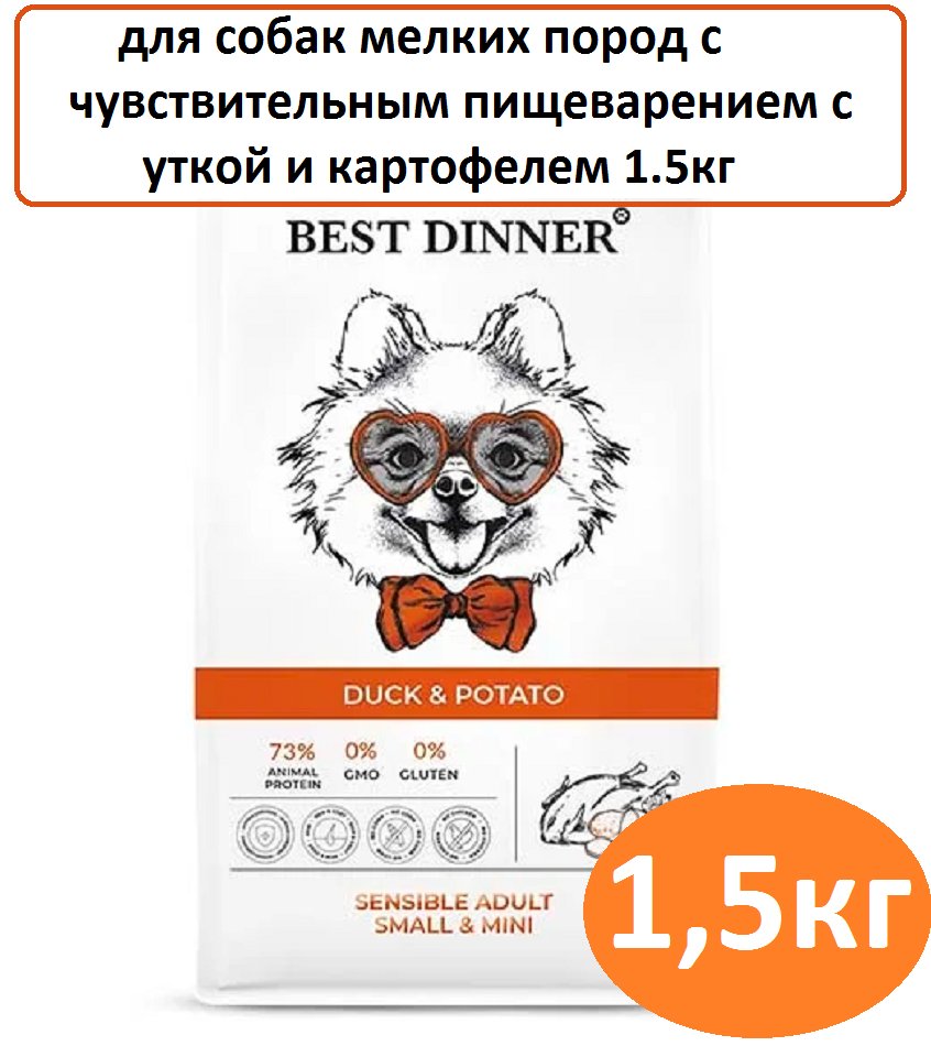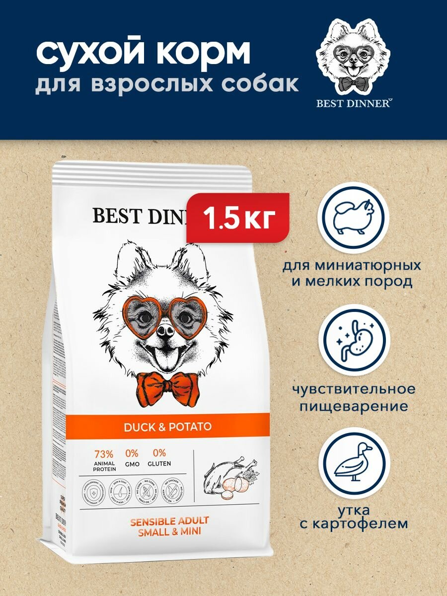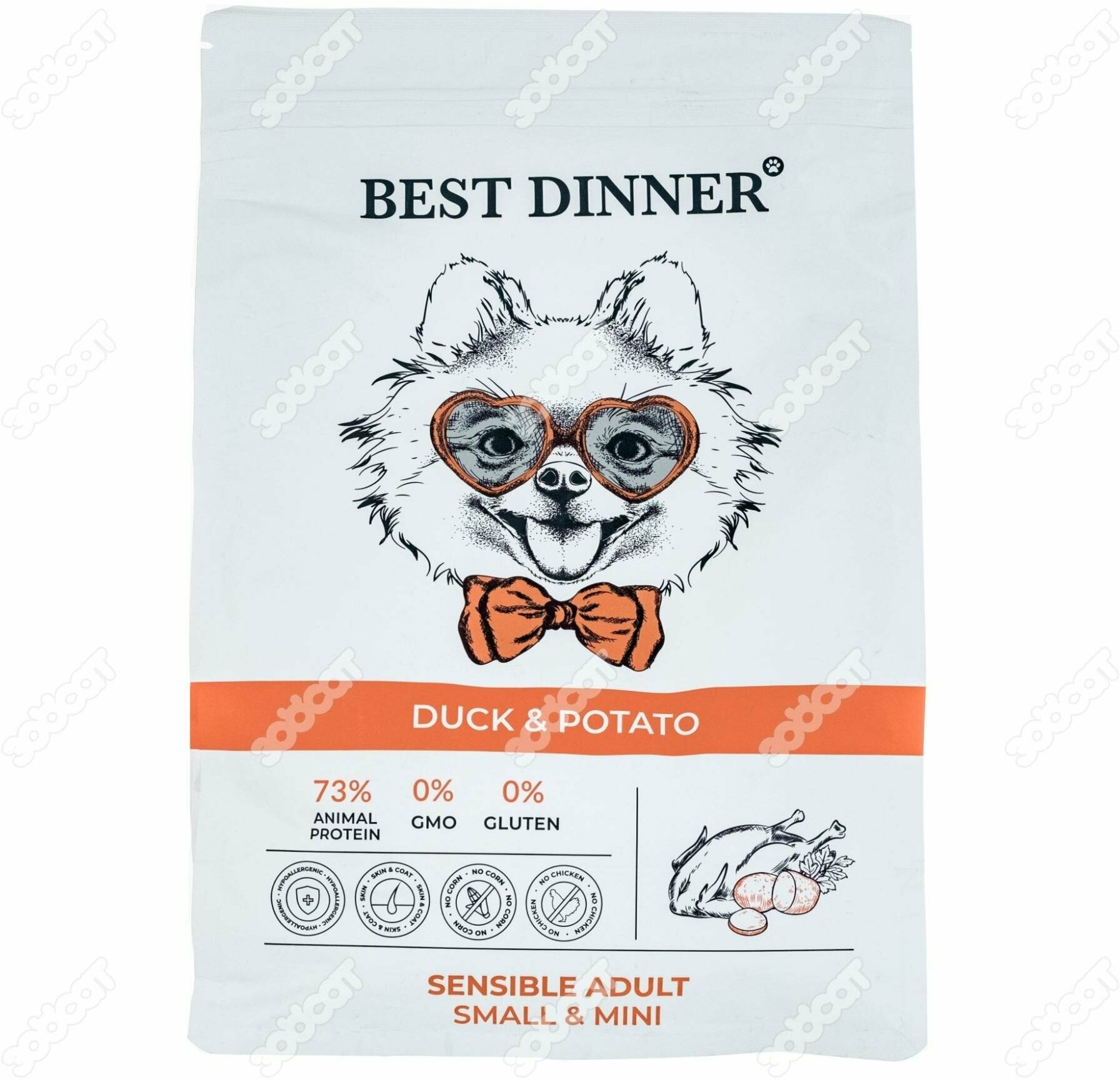 Купить Best Dinner Adult Sensible Mini Duck & Potato сухой корм для собак мелких пород склонных к аллергии и проблемам с пищеварением с уткой и картофелем - 1,5 кг