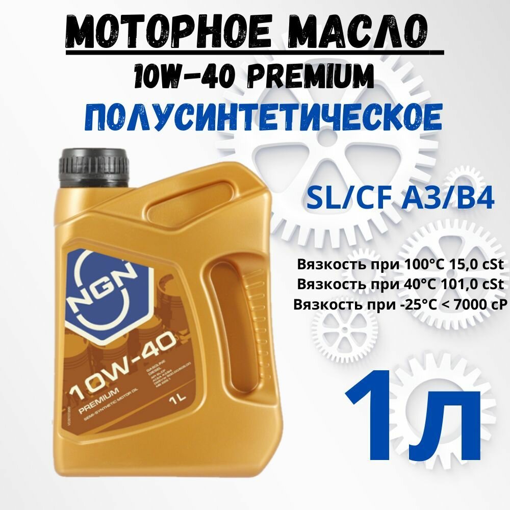 Масло моторное NGN PREMIUM 10w40 полусинтетическое, SL/CF, ACEA A3/B4, универсальное, 1л, арт. V172085606