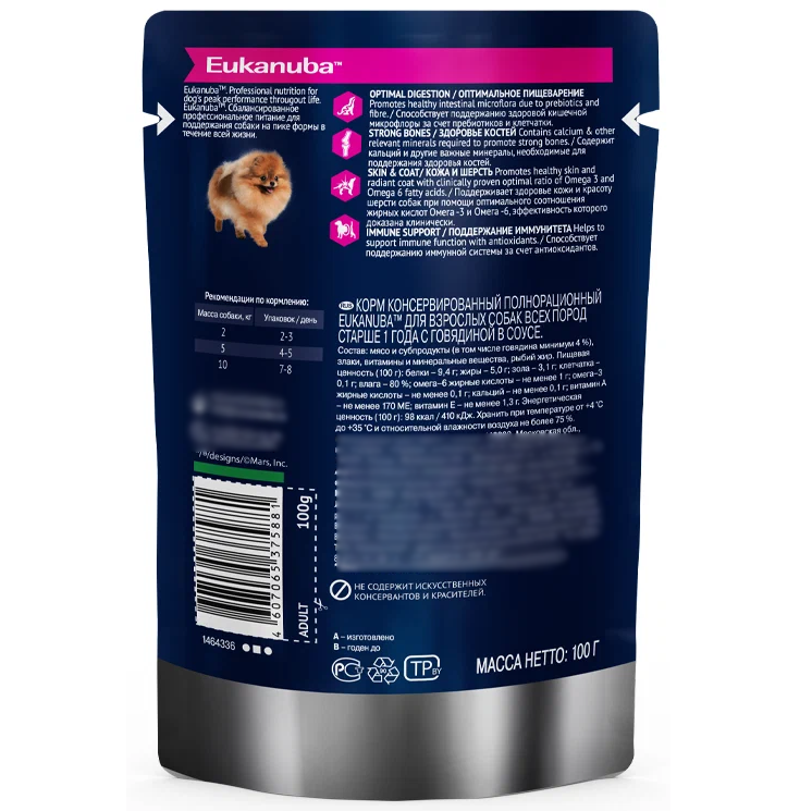 Влажный корм (Паучи) Эукануба для взрослых собак с Говядиной в соусе (цена за упаковку) 100г x 24шт